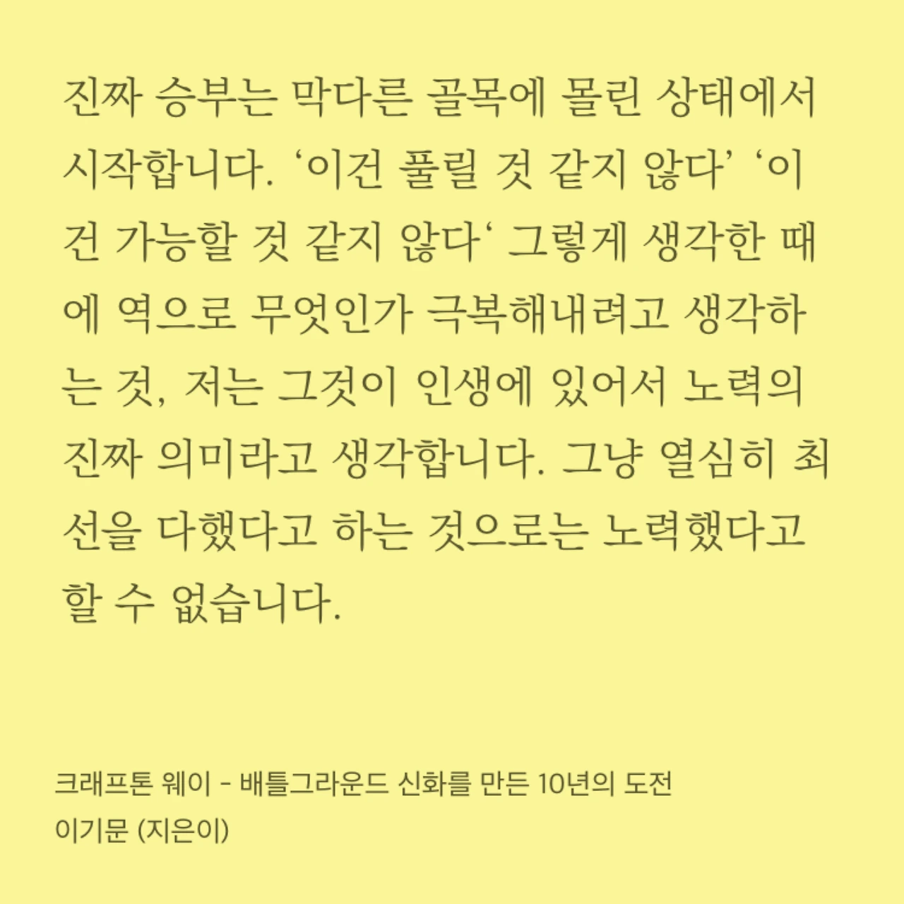 “진짜 승부는 막다른 골목에 몰린 상태에서 시작합니다. ‘이건 풀릴 것 같지 않다’ ‘이건 가능할 것 같지 않다‘ 그렇게 생각한 때에 역으로 무엇인가 극복해내려고 생각하는 것, 저는 그것이 인생에 있어서 노력의 진짜 의미라고 생각합니다. 그냥 열심히 최선을 다했다고 하는 것으로는 노력했다고 할 수 없습니다.”