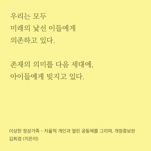 “우리는 모두 미래의 낯선 이들에게 의존하고 있다. 존재의 의미를 다음 세대에, 아이들에게 빚지고 있다.”