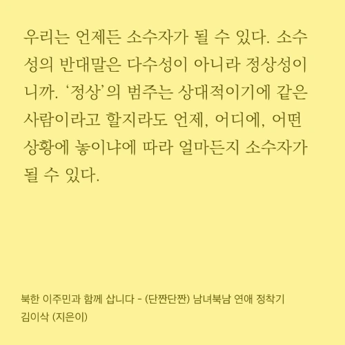 "우리는 언제든 소수자가 될 수 있다. 소수성의 반대말은 다수성이 아니라 정상성이니까. ’정상‘의 범주는 상대적이기에 같은 사람이라고 할지라도 언제, 어디에, 어떤 상황에 놓이냐에 따라 얼마든지 소수자가 될 수 있다."