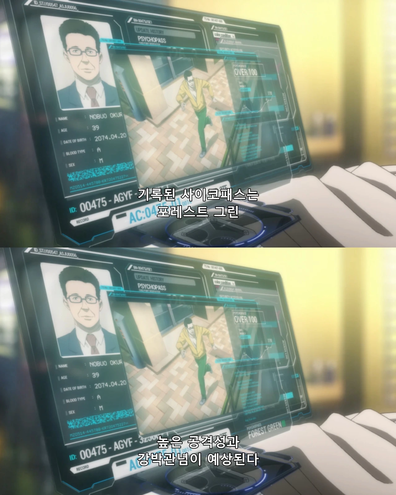 시빌라는 도시 전역에 설치된 사이매틱 스캐너를 통해 시민들의 심리상태를 숫자와 색으로 계측하고, 나아가 ‘범죄계수’를 산출해 잠재적 범죄자를 판별한다.