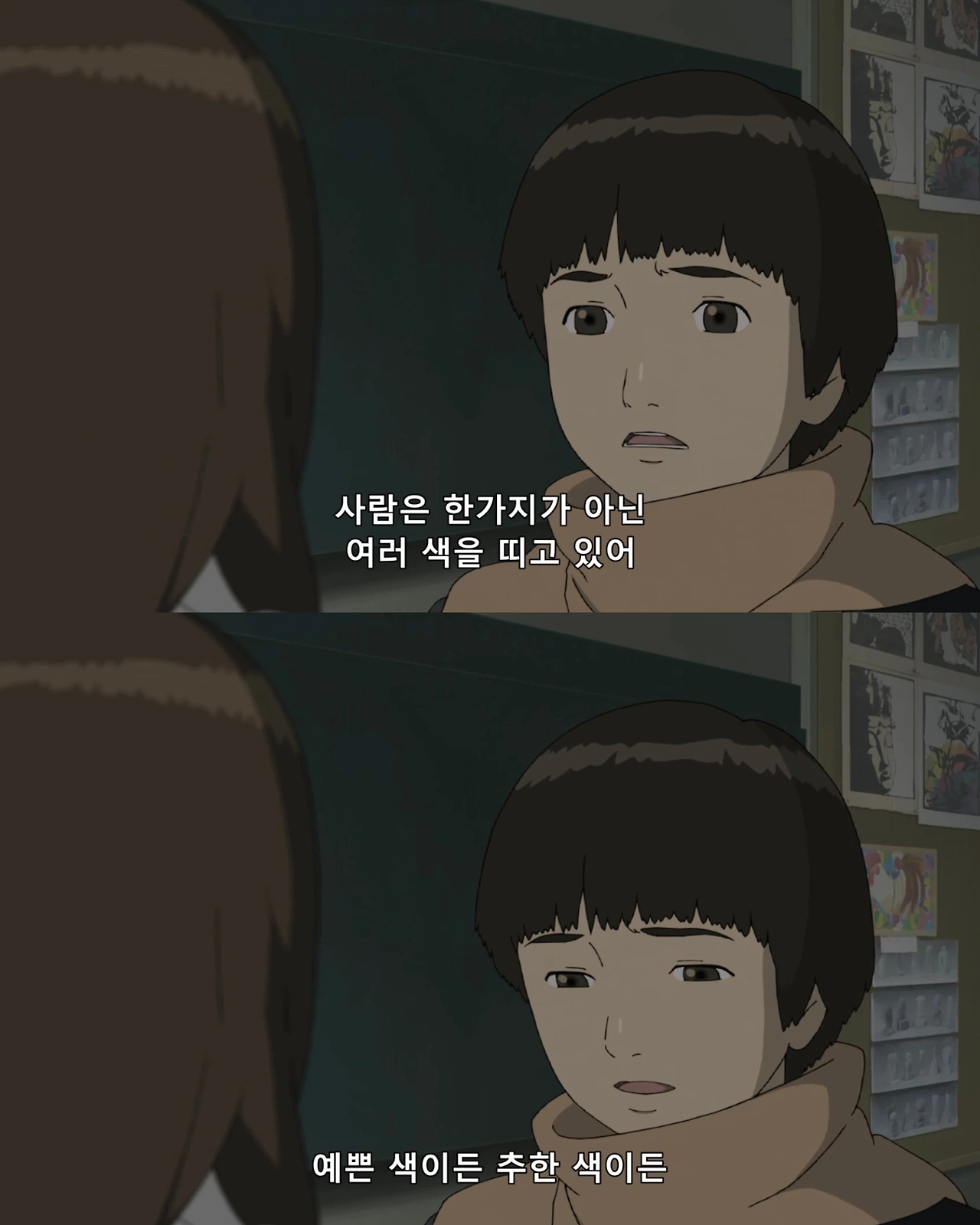 진정한 나의 색이라는 것은 없다. 내가 정한 색은 나를 가두는 선입견일 뿐이다. 마코토가 그린 그림을 히로카는 하늘을 나는 말로 보고, 쇼코는 수면을 향해 헤엄치는 모습으로 보는 것과 마찬가지로 말이다. 우리도 정답이 없는 그림인 것이다.