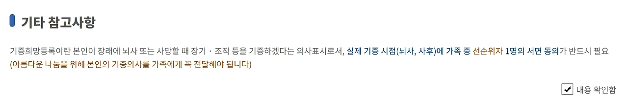 기증희망 등록은 장래에 뇌사나 심정지에 이르렀을 때 본인의 장기나 신체조직을 대가 없이 기증하겠다는 의사표시다. 신청 후 언제든 의사를 철회할 수 있으며, 법적 효력이 없다는 점에서 내게는 부담이 적게 느껴졌다. 실제로 기증희망 신청자이더라도, 사망 시 유가족의 동의가 있어야 기증이 가능하다.