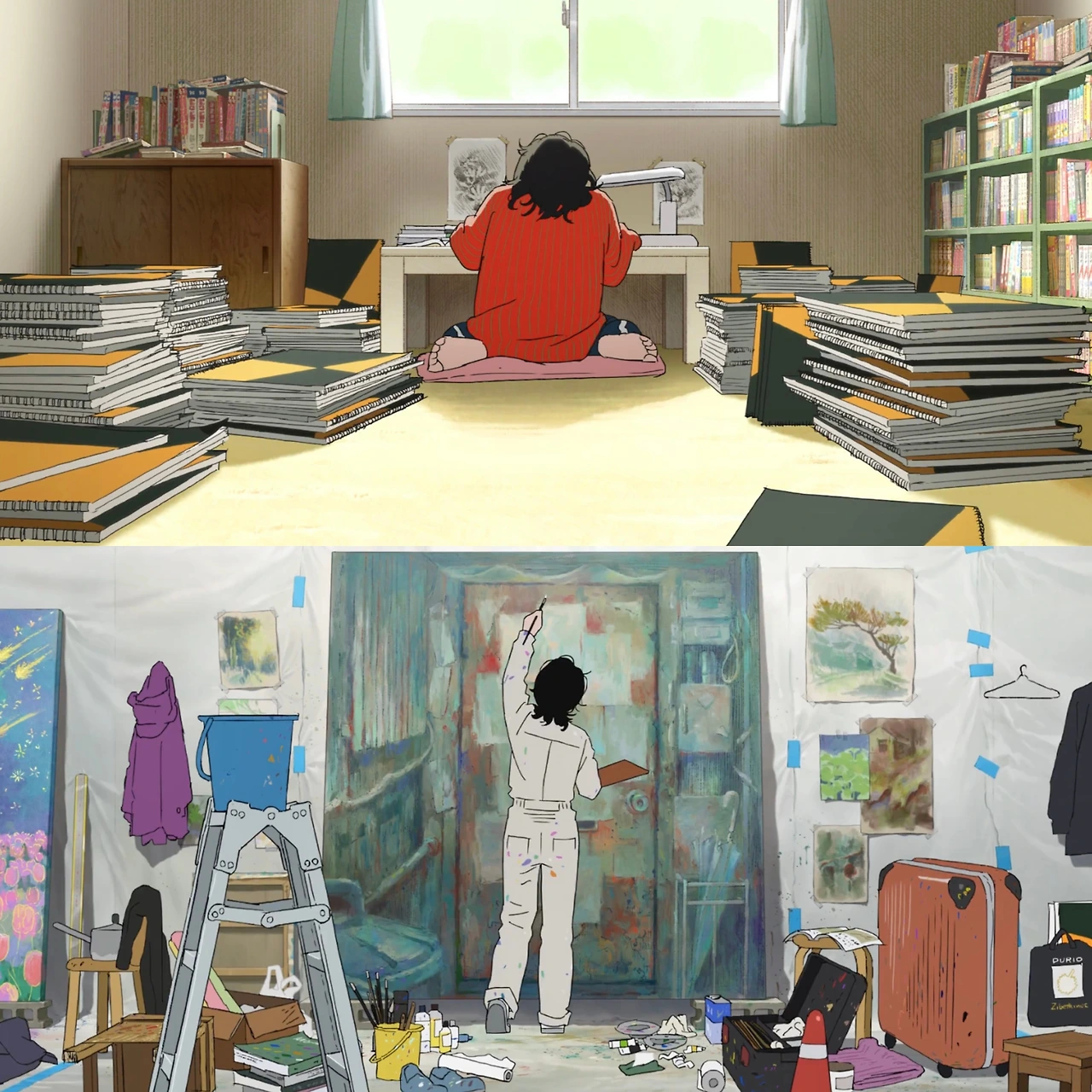 후지노가 인물의 선을 그리며 이야기를 만들어갈 때, 쿄모토는 그녀의 등 뒤에서 배경을 채운다. 쿄모토는 세상에 발을 디딜 때도, 만화를 그릴 때도 항상 후지노의 뒤에 있다. 하지만, 그 ‘뒤’는 따라가는 자리가 아닌 함께 걸어가는 자리다.
