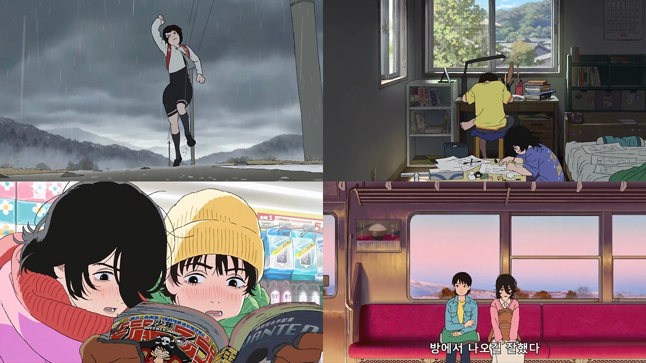 두 사람이 그린 네 컷 만화가 문틈으로 넘나드는 다른 시간대에서, 서로를 모른 채 여전히 꿈을 좇는 또 다른 후지노와 쿄모토. 이 세계는 남겨진 이들이 죄책감의 굴레에서 벗어나길 바라는 작가의 애도이자, ‘꿈은 이어진다’는 낮고 단단한 위로다.