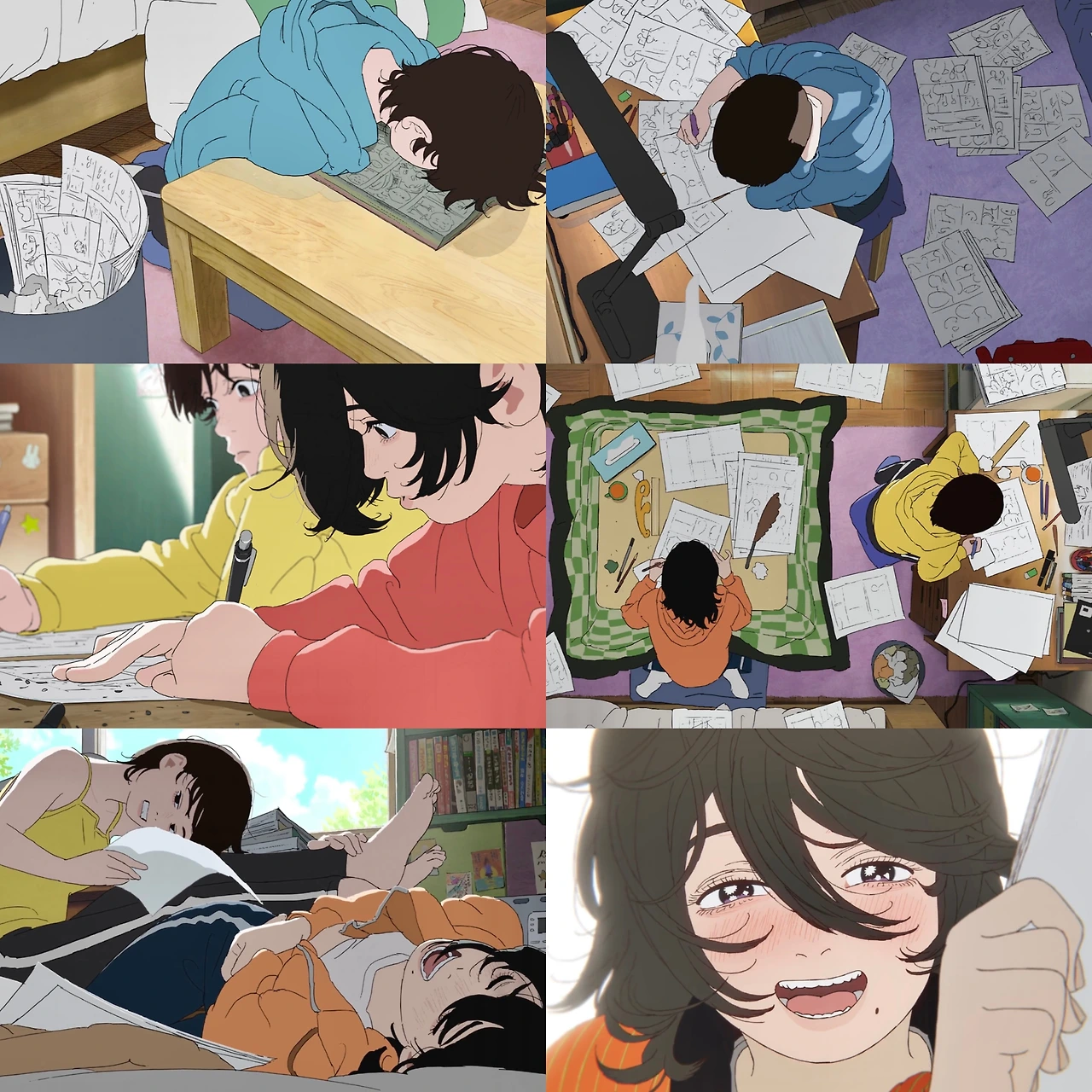 작업실로 돌아온 후지노는 채워지지 않은 네 컷 종이를 책상 앞에 붙인다. 그리고 다시 만화를 그리기 시작한다.