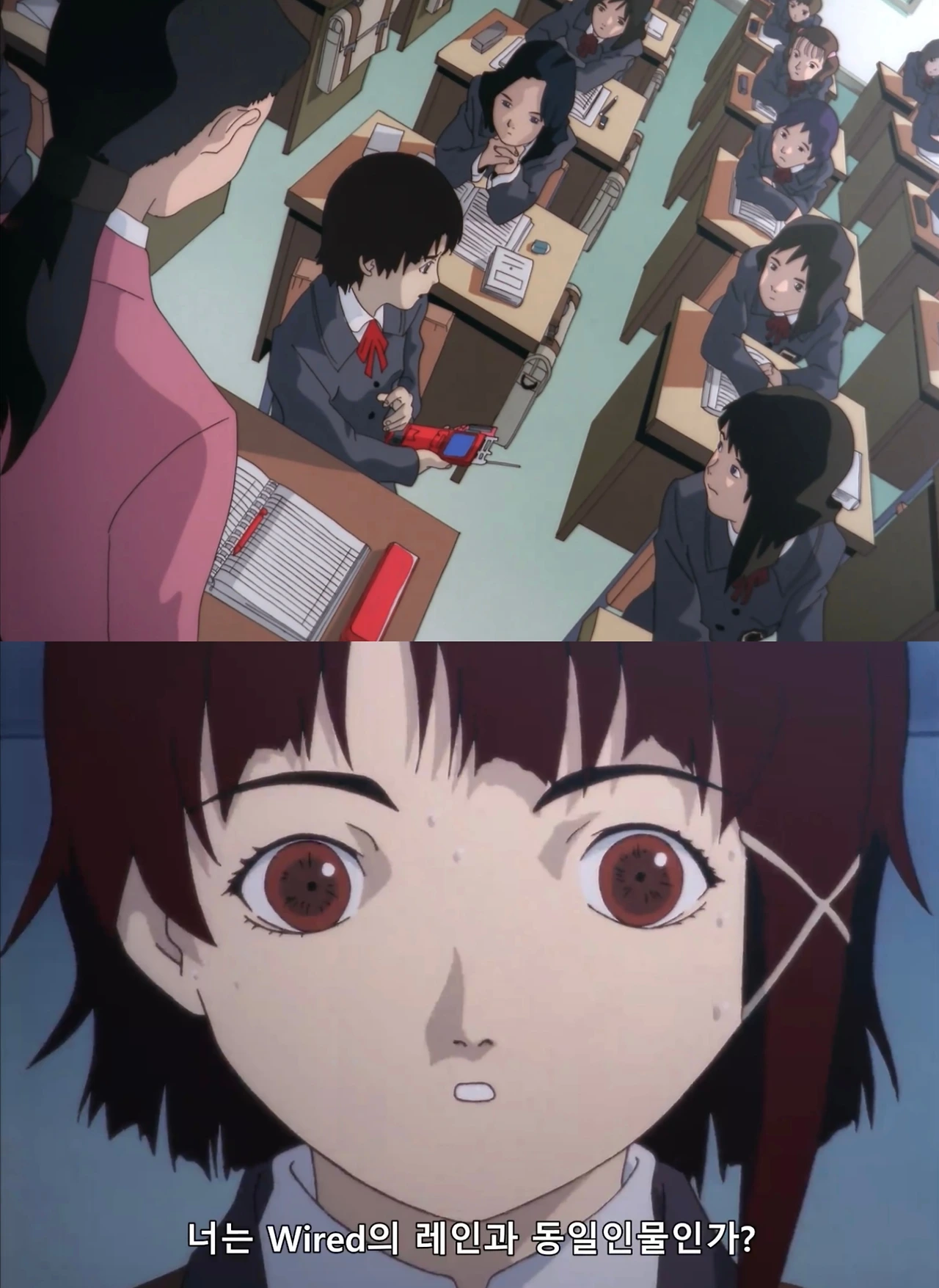 현실의 레인이 비밀을 유출했다는 오해 속에서 교실의 모든 시선이 그녀에게 꽂히는 이 오싹한 장면은, 네트워크 사회에서 개인이 얼마나 쉽게 가해자이자 피해자가 되는지를 보여준다. 연결된 모든 이들에겐 책임과 혐의가 부과되는 것이다.