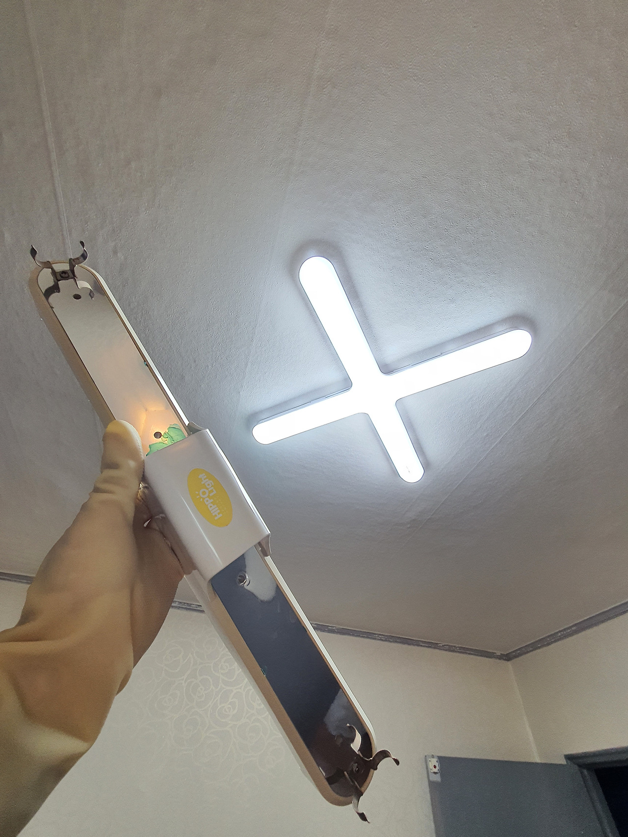 LED 등을 사서 갈기 위해 기존 형광등을 제거했다. 제멋대로 몰딩 해놓은 고정판이 시멘트에 매몰되어 움직일 수 없었다. 궁리 끝에 중간판을 덧대고 그 위에 LED 등을 달았다. 깨끗했다.