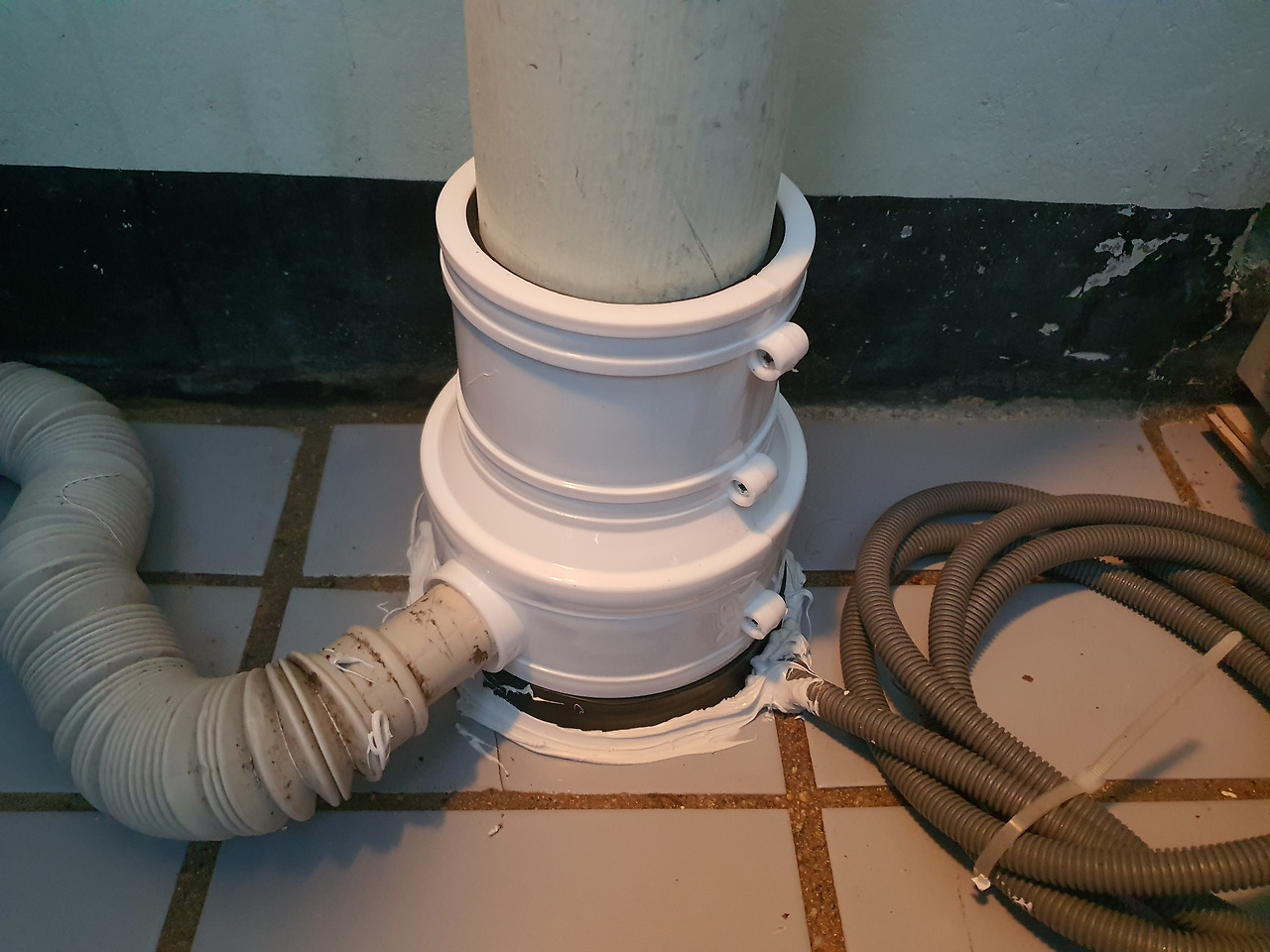 이 아파트 베란다 하수구는 벌레와 냄새로 유명하다. 배수구를 특수용기로 밀봉하고 실리콘 총으로 마감했다.