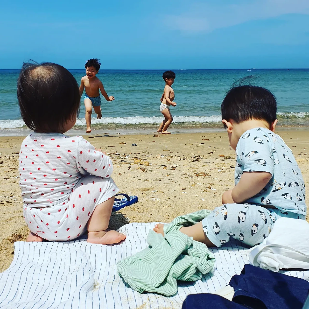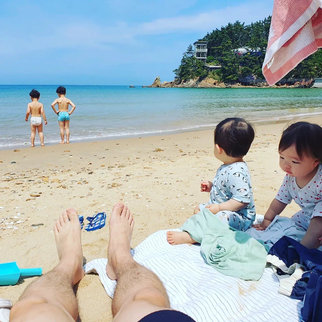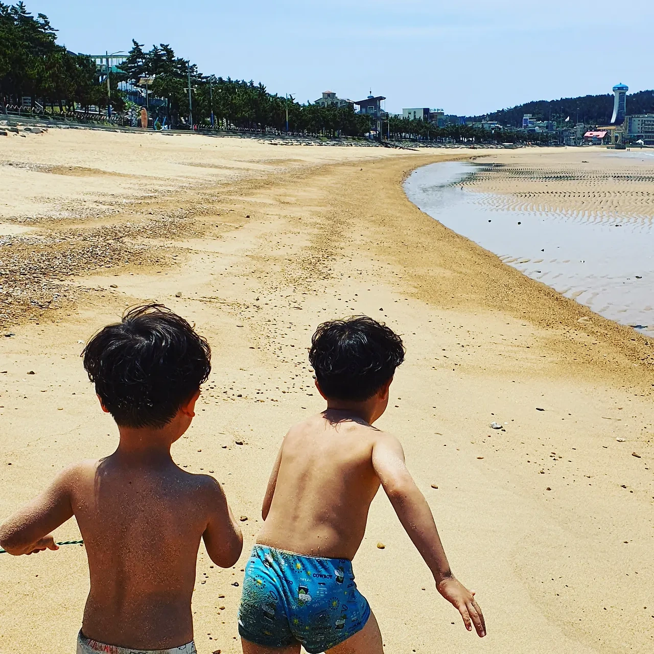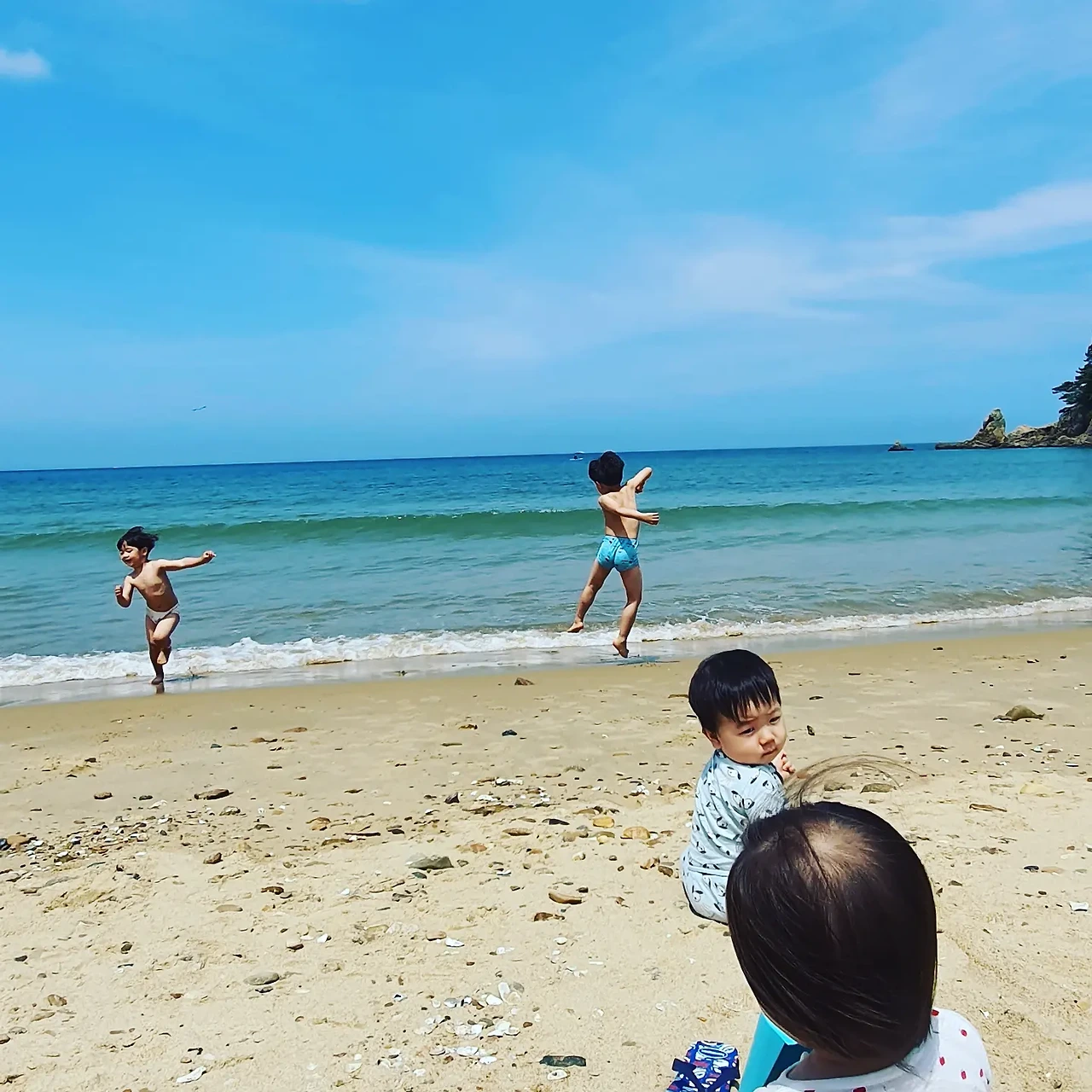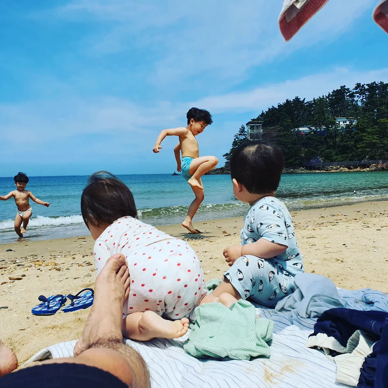 아이들을 벗겨 팬티만 입혀 놓으니 얼추 해수욕 패션이 완성되었다. 특별히 뭐라 언급할 것도 없이 자기들끼리 준비운동을 하고 해변을 뛰어다니며 한 걸음씩, 한 뼘씩 물속으로 들어갔다.