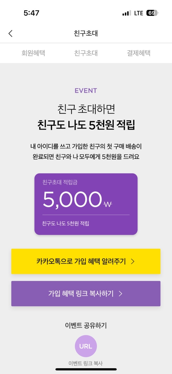 - 컬리의 바이럴 계수는 그렇게 높지 않을 것으로 예상된다. 혜택이 크지 않을 뿐더러(5천원이면 공짜로 뿌리는 혜택 수준임) 굳이 찾아서 들어가지 않는 한 추천에 대한 이벤트를 확인하기 어렵다.