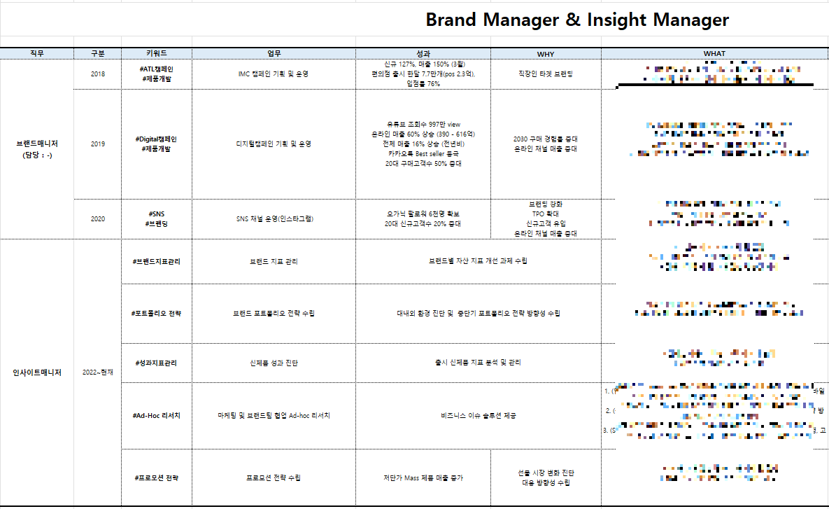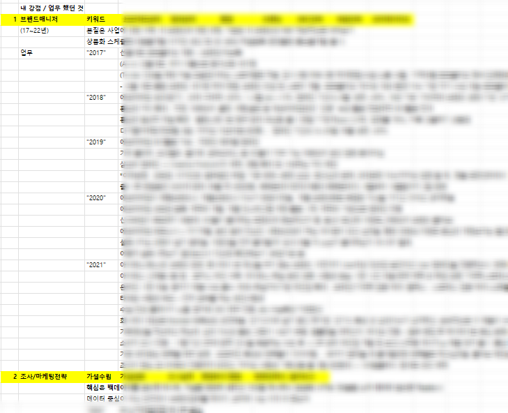 다 적었다면, 이를 다시 구조화 하는 것이 필요하다. 몇 번의 수정을 거치고, 이력서를 써보다 보니 최근 다시 이 백데이터 구조를 수정하였는데 아래처럼 정리해 두는 게 다양하게 써먹기 좋은 것 같다. 나의 경우 브랜드 매니저로 5년, 인사이트 매니저로 2년째 일하고 있는데 직무를 구분해서 적었다.