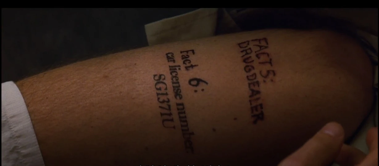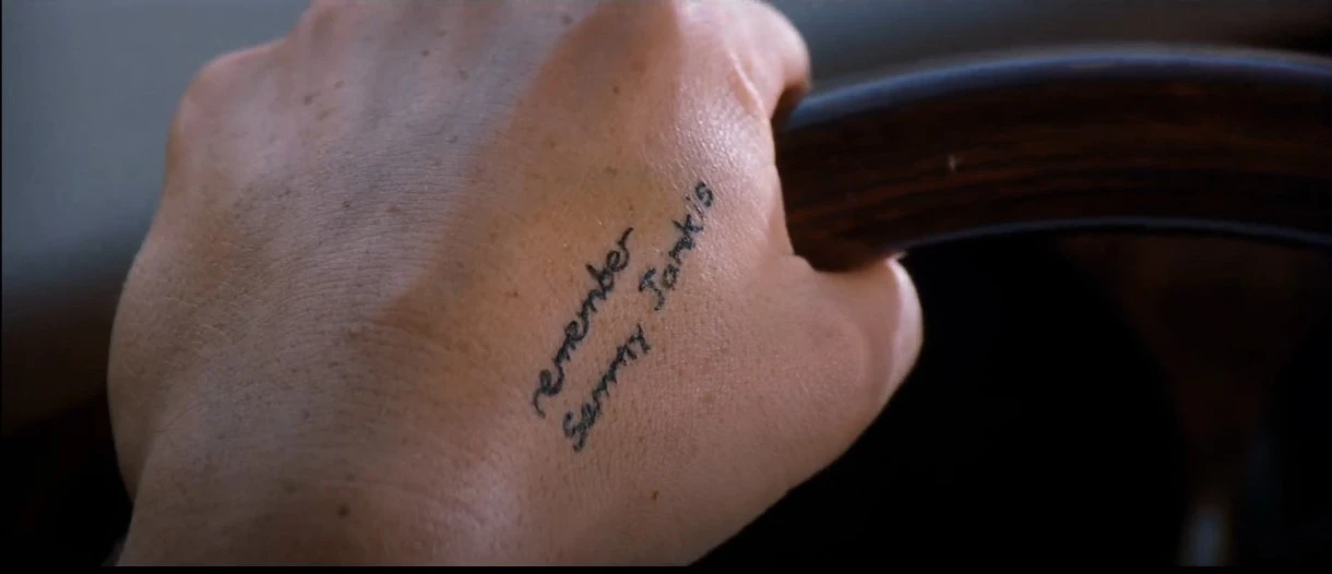 'Remember Sammy Jankis(새미를 기억하라)'는 단기기억상실증에 걸린 레너드가 새미와 다른 방식으로 삶을 살아가는 모습을 보여준다. 레너드에게 새미는 자신의 상태를 비추는 거울 같은 존재다. 영화 마지막에서 새미를 통해 캐서린이 죽게된 이유가 레너드 자신임을 암시하며, '새미를 기억하라'는 문신은 '레너드 자신을 부정하라'는 메시지로 읽힌다. 실제 새미는 아내가 없는 사기꾼이며, 레너드는 아내 캐서린을 죽게 한 죄책감을 새미에게 투사함으로써 고통을 회피한다. '새미를 기억하라' 문신은 캐서린의 죽음을 '기억하라'는 명령이지만 동시에 이 말을 부정해야 한다. 그래서 레너드에게는 새미를 기억하면 할수록 동시에 자신을 부정하라는 역설적 메시지로 전달된다.