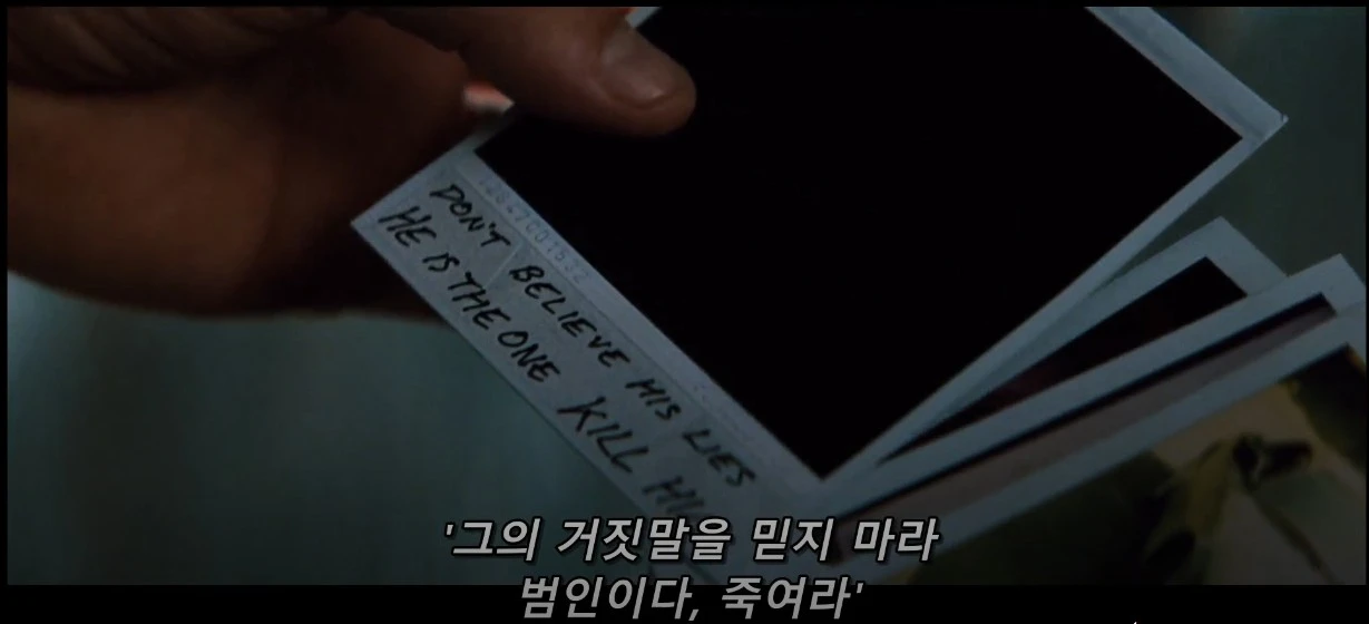 폴라로이드 사진에 쓰인 'He is the one kill him'는 '그가 범인이다, 그를 죽여라'로 번역되지만, 원문에는 쉼표가 없어 '그는 그를 죽이는 사람이다'로 해석해야 한다. 즉, 레너드는 존G를 쫓지만, 자신이 존G 이기에 결국 '그는 그를 죽이는 사람'이 된다. '흑백'에서 테디가 설정한 가짜 존G를 '그가 범인이다, 그를 죽여라'로 해석이 될수 있지만, '컬러'에서는 '그는 그를 죽이는 사람이다'로 읽힌다. '컬러'에서 존G가 누구든 레너드는 그를 쫓지만, 스스로 범인이기 때문에 존G를 죽일(Kill Him) 수 없다. 존G를 죽이더라도 실제 존G가 아니기 때문에 다시 존G를 추적해야 한다. 이는 진실을 부정하면서도 진실을 쫓는 레너드에게 진실은 빈자리로 남는다.