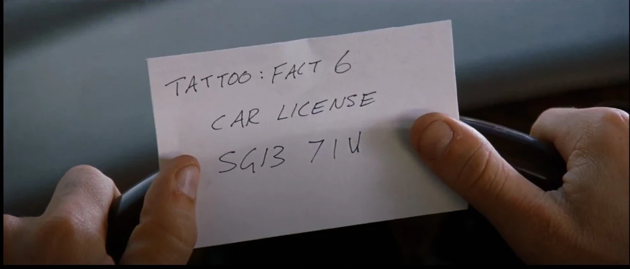 영화 <메멘토>의 초반, 레너드는 낯선 모텔에서 깨어나 자신의 몸에 새겨진 문신, 'John G Rape and Murdered My Wife(존G가 나의 아내를 강간하고 살해했다)'를 발견하고 거울을 통해 이를 바라본다. 그러나 이 문장은 거울이 아닌 정면에서 보면 'My Wife Murdered and Raped John G'로 의미가 뒤바뀐다. 보통 'Rape'는 강제로 성적인 관계를 맺는 행위를 의미하지만, '성적인'을 제거하면 '강제로 관계를 맺다'가 된다. 여기서 'Rape'는 '강탈하다' 또는 '약탈하다'라는 의미를 지니므로 'My Wife Murdered and Raped John G'는 '나의 아내는 존G를 살해하고 강탈했다'로 읽힐 수 있다.