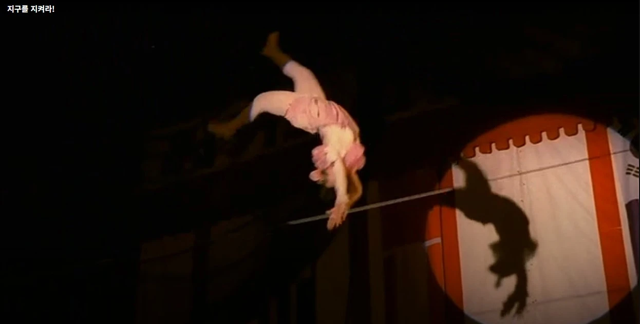 개기월식 D-7. 지구를 지키느냐 마느냐를 판가름하는 순간이 다가오고 있다. 월식이 가까워질수록 지구의 그림자는 점점 더 커지고 길어진다. 지구가 병들었다는 건 사람과 사람 사이의 관계가 점점 폭력으로 점철되기 때문이다. 사회 정의를 외치며 사건을 해결해야 할 형사들은 오히려 서로 반목하고, 과도하게 폭력을 휘두르며 부패해 있다. 병구는 폭력에 찌든 삶을 살아왔고, 강아지 '지구'를 보살피지만 '지구'는 인육을 먹는 걸로 보인다. 그림자가 드리운 이 폭력적인 세상에서 순이는 그림자가 없는 존재, 순수 그 자체이다. 병구는 순이가 외줄을 타는 모습을 보고 사랑과 동시에 경외감을 느낀다. 공중에서 좌우로 흔들리며 외줄을 타는 순이의 모습은 '달'을 닮았다.