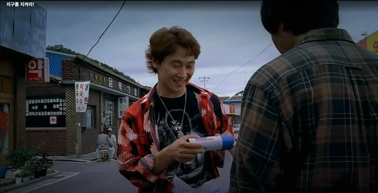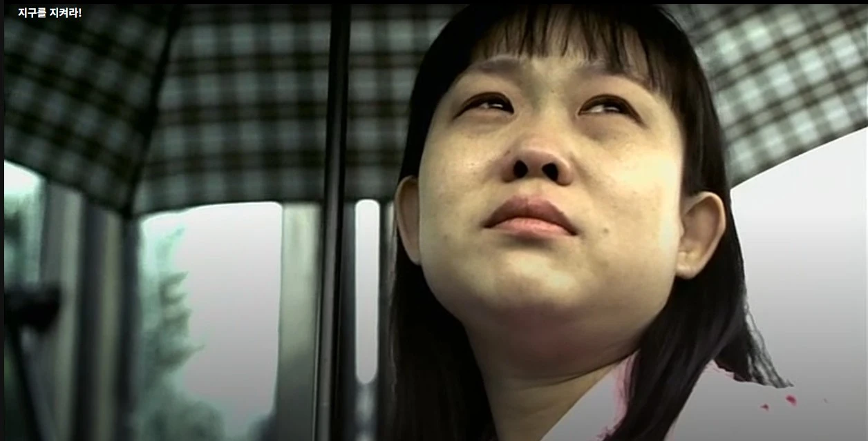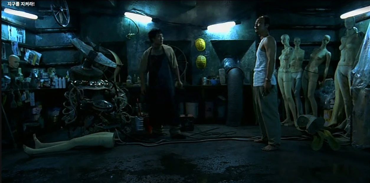 <지구를 지켜라>는 병구의 머릿속에서 지구를 위협하는 존재를 외계인으로 상정한다. 순이는 병구 곁에서 그의 말을 듣고 따른다. 그러나 관객은 병구의 망상적이고 교조적인 태도를 보며 심신 미약 순이가 이용당하고 있는 것은 아닌지 걱정하며 의심을 품게 된다. 영화가 진행되면서 드러나는 병구의 과거는 순탄치 못하고 오히려 비극적이다. 결국, 극단적인 상황에 몰린 병구의 불안증세가 아닐까 하는 의심을 가지게 된다. 병구는 마네킹 제작 일을 통해 자기 정체를 위장하고 생계를 유지한다. 마네킹은 속이 텅 빈, 껍질만 남은 인간의 형상이다.