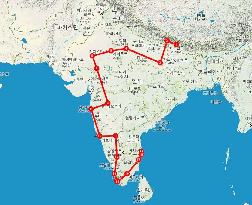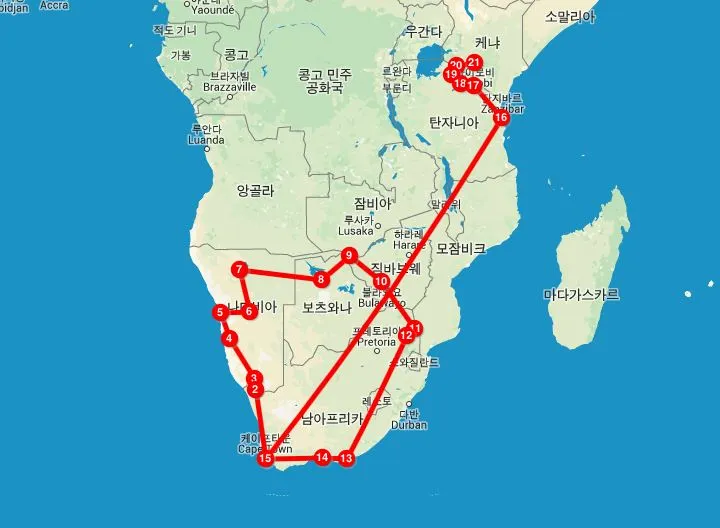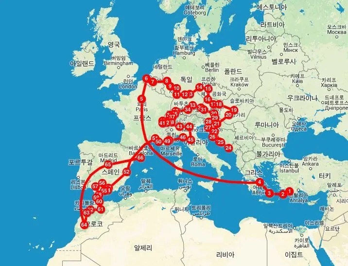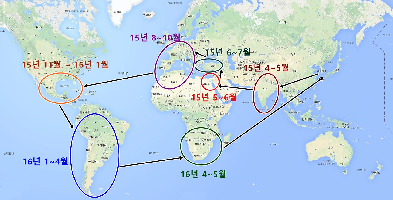지도 위에 흩어져서 찍힌 점들을 그룹으로 묶고 다시 선으로 잇는 일을 반복하다 보니 점점 여행 경로의 윤곽이 드러났다. 그리고 가능하면 여행 중에 겨울을 만나지 않도록 여행 시기를 조정했다. 수없이 수정을 반복한 결과 세계지도 위에 한국에서 출발해서 다시 한국으로 돌아오는 한붓그리기를 완성할 수 있었다.