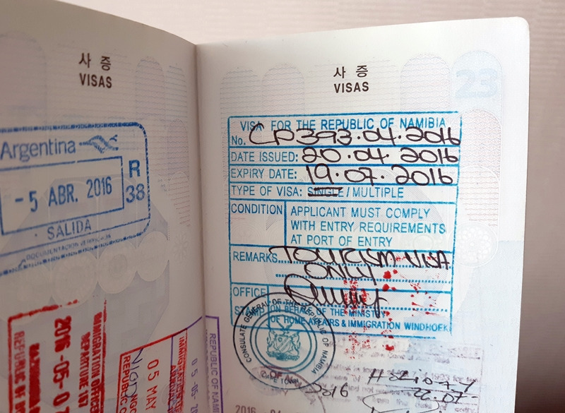 여행을 다니다 보면 우리나라 여권을 부러워하는 다른 나라 여행자들을 많이 만날 수 있다. 마치 자유이용권처럼 대부분의 나라를 비자 없이 입국이 가능한 우리나라 여권의 파워는 막강했다. 이번 세계여행 중에 별도로 비자를 별도로 발급받았던 국가는 손에 꼽을 정도로 국가별 출입국에 대한 준비가 크게 필요치 않았다. 그러나 나미비아는 예외였다. 장기 여행자들 사이에서도 남미의 볼리비아와 더불어 비자 서류가 까다로운 국가 중에 하나가 바로 나미비아였다. 비자신청서와 사진은 기본이고 여행 일정표, 여행 동기 및 목적 에세이, 은행 거래 내역서, 숙박 예약 확인증 그리고 출입국 교통편 증명서 등이 필요했다. 열심히 서류를 준비해서 대사관을 찾아갔건만 바로 출입국 교통편이 나를 가로막았다. 렌터카를 이용해서 입국할 계획이라고 했더니 렌터카 계약서를 제출하라고 했다. 렌트를 하려면 비자가 필요하고 비자를 발급 받으려니 렌트 계약서가 필요하다니...