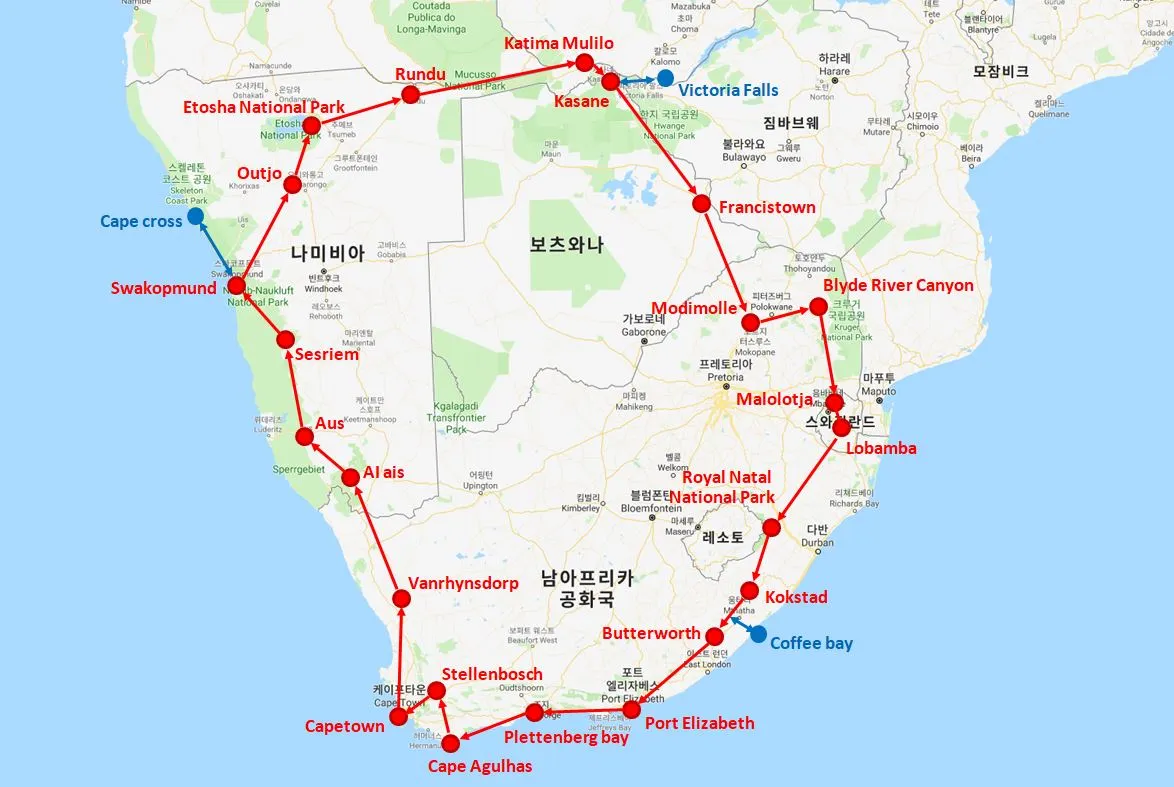 케이프타운을 출발점으로 시작될 남아프리카 여행은 남아공 서부를 따라 북쪽으로 올라가서 나미비아로 입국하여 보츠와나, 짐바브웨를 거쳐 남아공 동부로 돌아오는 시계방향의 경로를 계획했다. 다시 남아공으로 입국하게 되면 에스와티니(스와질란드)를 거쳐 가든 루트로 알려진 남아공의 남쪽 해안선을 따라 케이프타운으로 돌아오는 것으로 여행을 마무리하기로 했다. 남미를 여행하던 중에 틈틈이 여행 준비를 해왔었지만, 아프리카 여행을 위한 정보는 턱없이 부족했다. 아직은 대중적인 여행지가 아니라서 인지 인터넷을 통해 얻을 수 있는 정보는 제한적이었다. 그나마 관광 포인트에 대한 자료는 조사가 가능했지만 대중교통에 대한 정보는 도무지 찾을 길이 없었다. 막상 케이프타운에 도착해서 알아보니 아프리카 지역의 도시 간, 국가 간 대중교통은 거의 전무한 실정이었다. (어쩌면 내가 못 찾은 것일지도 모르겠다.) 그래서인지 대부분의 여행자들은 커다란 트럭을 버스로 개조한 차량을 타고 일정한 루트를 따라 이동하는 '트럭킹'이라고 불리는 패키지여행 상품을 활용하고 있었다. 그동안 일정에 구애받지 않고 자유롭게 여행해오던 터라 일정과 경로가 결정되어 있는 패키지여행 상품이 그리 매력적으로 느껴지지 않았다.