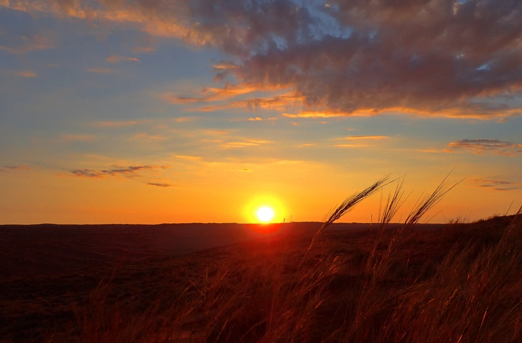 엘림 듄의 모래 언덕 넘어 해가 진다.
