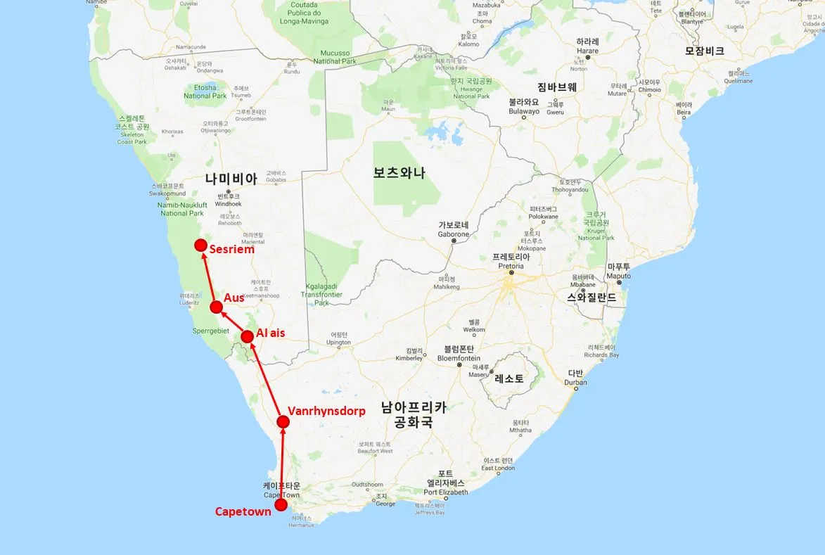 경이로운 모습으로 감동을 준 피쉬리버 캐년을 떠나 다음 목적지인 나미브 사막으로 출발했다. 차를 돌려 떠나면서도 등 뒤로 거대한 존재가 쳐다보고 있는 것처럼 느껴질 정도로 피쉬리버 캐년이 준 위압감은 대단했다. 다시 끝이 보이지 않는 황무지 사막의 비포장길을 흙먼지를 폭풍처럼 날리며 외롭게 달려야 했다. 나미브 사막의 초입인 세스리엠(Sesriem)까지는 600km가 넘는 거리로 내가 빌린 소형차로 비포장길을 달리는 속도로는 도저히 하루에 갈 수 있는 거리가 아니었다. 그렇다고 풀 한 포기 없는 사막 한가운데에서 밤을 보내는 것은 위험했기에 중간쯤의 작은 마을인 아우스(Aus)에서 하루 밤을 보내기로 했다.