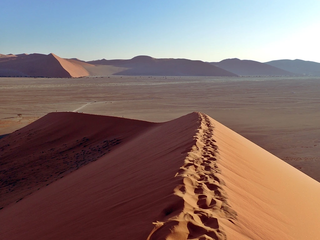 해가 뜨고 나서 보니 텐트 안의 상황은 생각했던 것보다 더 처참했다. 당장이라도 침구들을 들고나가서 털어내고 싶었지만 일단은 오늘의 일정이 우선이었다. 해가 떠올라 더워지기 시작하면 사막을 걷기 힘들기에 서둘러 출발해야만 했다. 듄 위에서 일출을 보기에는 조금 늦은 시간이라 곧바로 나미브 사막의 깊숙한 곳의 소수스플라이(Sossusvlei)로 향했다. 한 시간 가량을 달려 도착한 소수스플라이 입구에는 이미 부지런한 여행자들이 잔뜩 설레는 얼굴을 하고는 모여있었다. 여기서부터는 포장도로가 아닌 진짜 모래 위를 달려야 하기에 더 이상 우리의 차로 갈 수가 없다. 다행히도 NWR에서 사륜 트럭을 개조한 버스로 소수스플라이까지 셔틀 서비스를 운영하고 있었다. 어깨 높이만큼 떠오른 태양의 탓인지 설렘에 달아오른 탓인지 모르겠지만 저마다 붉은 얼굴을 하고 셔틀 트럭에 올라탔다. 모래 위에 깊게 길을 만들며 10여분을 달려서 드디어 소수스플라이에 도착했다.
