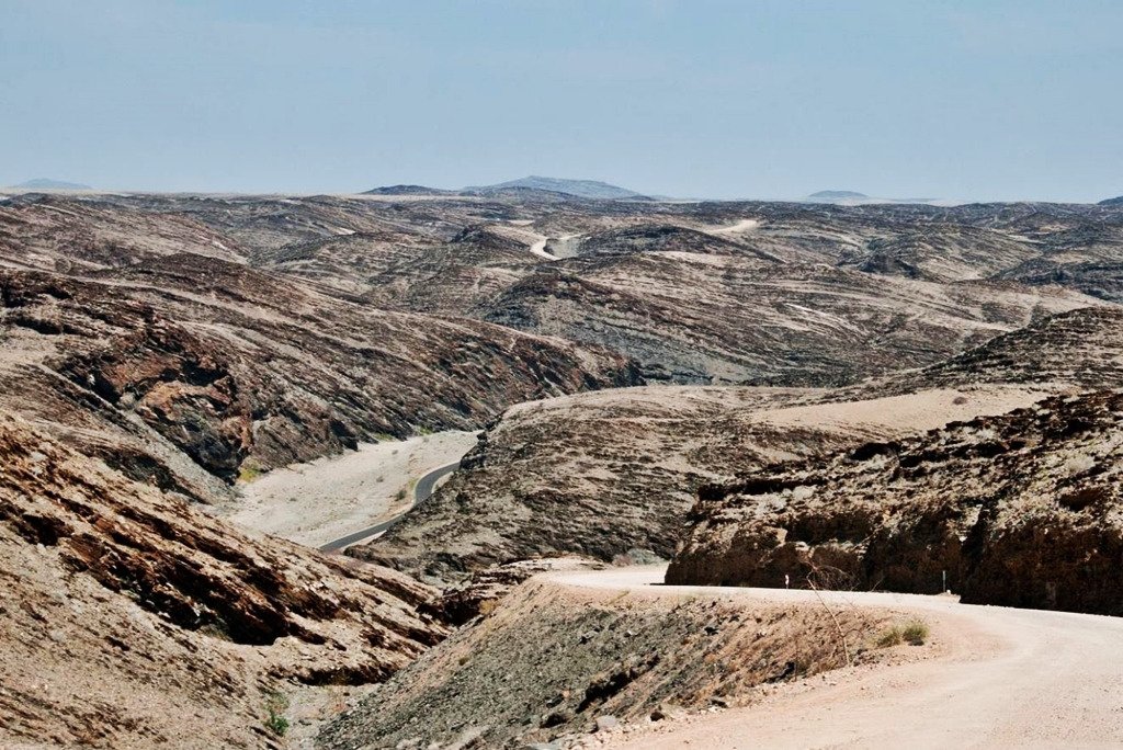 요 며칠간 모래 먼지를 뒤집어쓰고 쉬고 있었던 우리의 차는 다시 비포장 도로 위에서 흙먼지를 날리게 되었다. 아무리 달려도 변하지 않던 황색과 청색의 2 분할 바탕화면이 출발한 지 2시간쯤 지나자 조금씩 달라지기 시작했다. 이따금씩 돌무더기 보이는가 싶더니, 길은 어느새 겹겹이 쌓인 암석층 숲으로 둘러싸였다. 나미브 사막에서 서부 해안으로 넘어가는 쿠이셉 패스(Kuiseb pass)는 45도로 누운 퇴적층 위를 쿠이셉 강이 흐르면서 깎아내린 쿠이셉 캐년을 가로지르는 길목이다. 여행 중에 이런 암석 지대를 만나면 클리셰 같이 하는 말이 있다. '지구 같지 않은 곳, 마치 화성 위를 거니는 듯한 풍경' 그 누구라도 쿠이셉을 지난다면 똑같은 표현을 하게 될 것 같았다. 주변의 암석들이 이리저리 비틀려 있는 도로를 달리고 있으니 마치 영화 '인셉션'의 휘어지는 도로를 달리는 장면이 떠오르기도 했다. 그만큼 낯설고 기이한 풍경이었다.