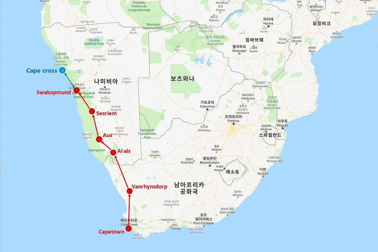 남아공 케이프타운에서 시작하여 나미브 사막에 이르는 여정 중에는 계속해서 광활하고 웅장한 아프리카의 자연을 보다가 케이프 크로스에 와서야 역시 아프리카는 야생의 땅이라는 것을 새삼 느낄 수 있었다. 나미브 사막에서 나미비아의 풍경을, 스바코프문트에서 나미비아의 역사를 봤으니 이제 본격적으로 나미비아의 야생을 보기 위해 에토샤 국립공원을 향해 출발했다.