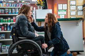 휠체어에 앉아 있는 딸, 그리고 헌신적인 어머니.