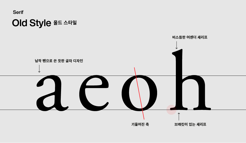 올드 스타일 세리프들은 손글씨를 바탕으로 한 아름다운 디자인으로 클래식한 분위기를 연출할 수 있고 높은 가독성 덕분에 본문 텍스트로도 활용하기 매우 좋은 서체들입니다. 글자의 세리프가 한 글자에서 다음 글자로의 눈의 이동을 쉽게 도와주기 때문에 피로를 줄여주어 편집 디자인에서 많이 활용되고 있습니다.
