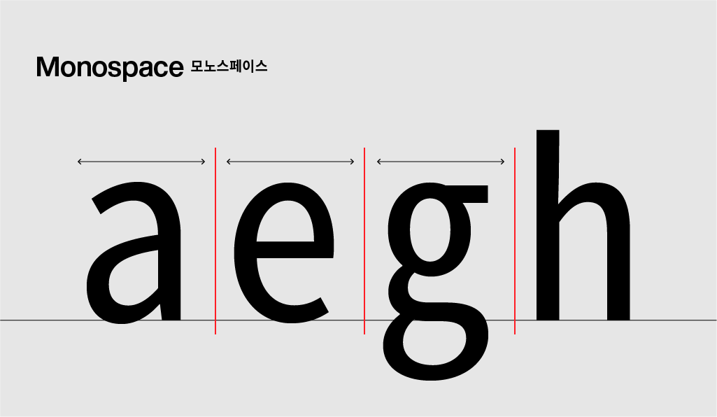 모노스페이스는 모든 글자 소가 같은 동일한 양의 수평 공간을 차지하는 폰트로, 가독성이 목적이 아닌, 컴퓨터나 특정 용도의 목적을 위해 고정된 폭을 유지하도록 설계되었습니다.