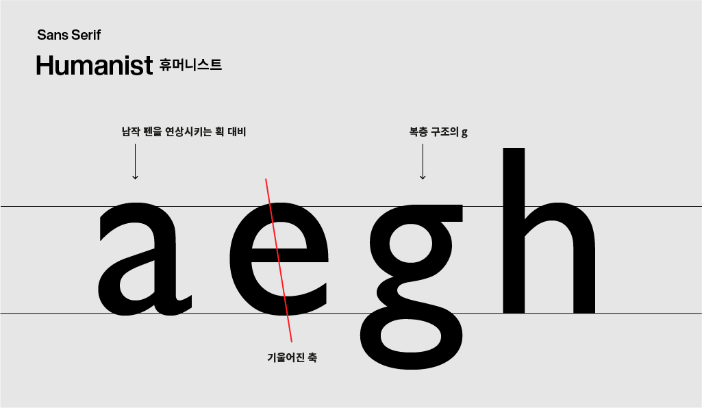 초기 가독성이 높았던 세리프 폰트들에 기반하여 디자인된 휴머니스트 산세리프체들은 다른 산세리프체들보다 글자의 판독성이 매우 좋습니다. 멀리서도 글자를 선명하게 읽을 수 있기에 공항과 같은 시설에 많이 활용됩니다.