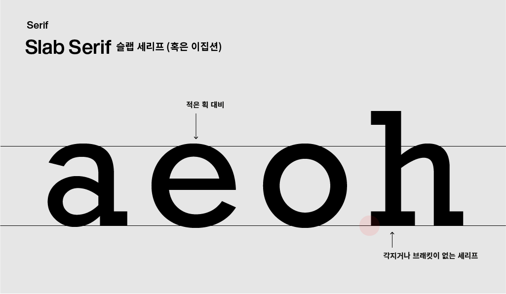 특유의 단단한 획 두께와 두꺼운 세리프를 가진 슬랩 세리프는 시각적인 이목을 끌어야 하는 간판과 포스터에 많이 활용됩니다. (본문에서의 활용은 권장하지 않습니다.)