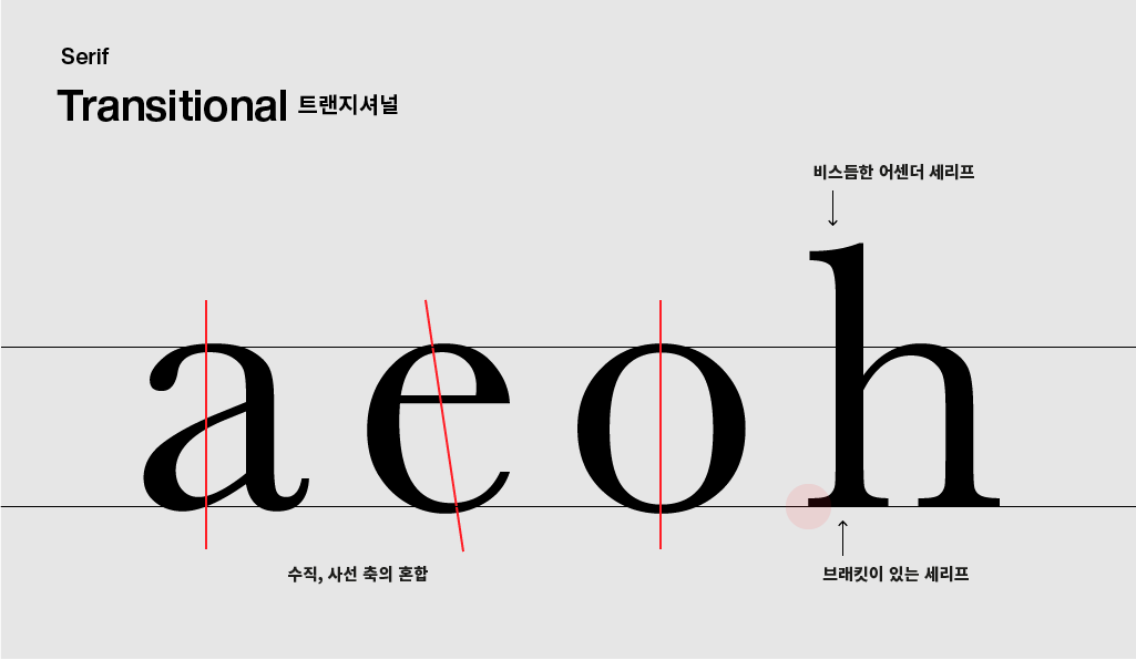 트렌지셔널, 과도기적 혹은 바로크라 불리는 이 분류의 세리프체는 18세기 중반에서 19세기 초반에 나타나 올드 스타일과 모던 스타일 세리프를 연결하는 다리 역할을 했습니다.