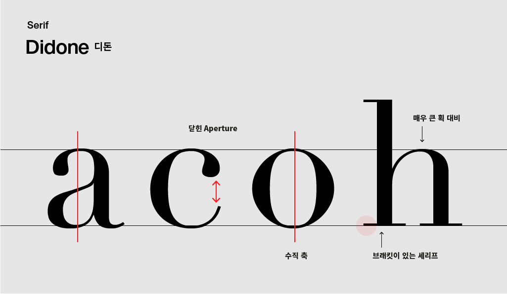 매우 극적인 획 대비와 각진 세리프를 가지고 얇은 세리프를 가지고 있는 디돈 세리프들은 특유의 럭셔리함으로 패션 브랜드에서 애용되었습니다. 하지만 낮은 가독성으로 본문으로는 활용되지 않습니다.