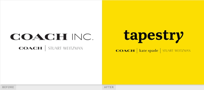 Tapestry는 Coach의 모회사로 Coach의 이름에 너무 의존하지 않기 위해 Coach Inc에서 수정된 이름입니다. Coach는 패션 브랜드 중에서 아직까지 세리프 폰트를 유지하고 있는 브랜드 중 하나인데요, 이번 Tapestry리브랜딩에서도 공 모양의 세리프가 인상적인 서체를 사용하여 단단하면서도 부드러운 이미지의 워드마크를 제작하였습니다.