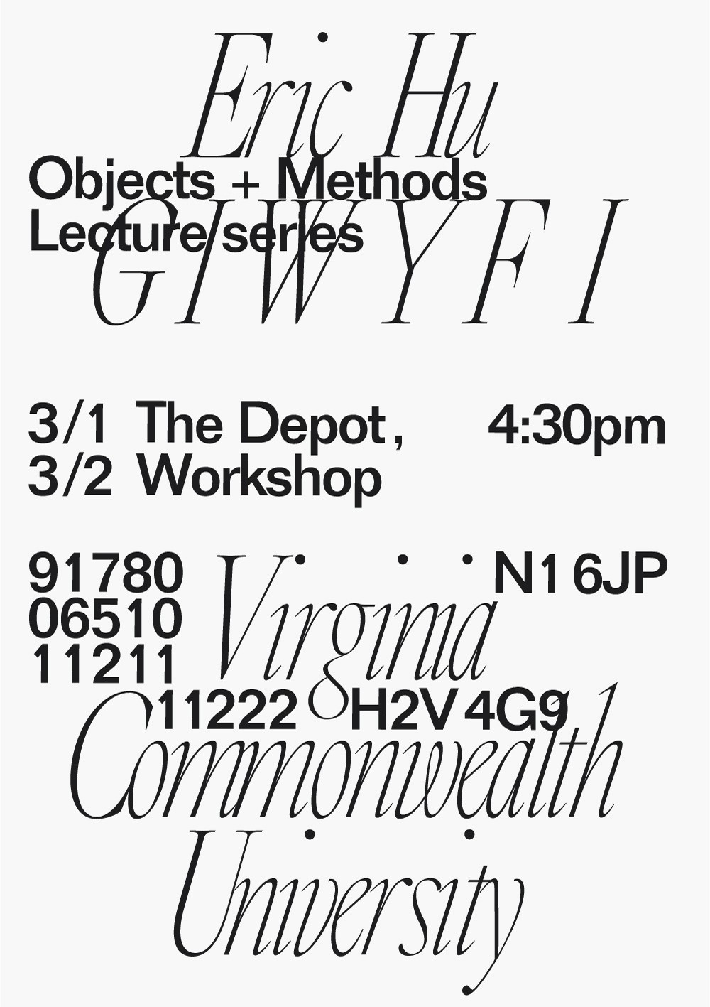 Eric Hu는 서체 조합에 능통한 디자이너입니다. 그의 서체 조합에는 언뜻 보기보다 더 많은 위계(order)가 숨어 있죠. 이 포스터는 두 가지 서체를 보여주고 있는데, 하나는 막대기처럼 생긴 이탤릭 서체와, 그로테스크 계열 서체입니다. 이 포스터에서 Hu가 이탤릭체를 사용하여 구조를 만들고 두 가지 스타일의 텍스트를 연결하는 방법에는 여러 가지가 있습니다. 디자인의 위쪽 반쪽부터 시작하여, 그가 이탤릭체의 앞부분을 그로테스크 서체의 높이에 맞추도록 주의를 기울이는 것을 볼 수 있고, 아래쪽 반쪽에는 "Virginia"에서 "g"의 아랫부분으로 인해 만들어진 공간에 숫자가 나란히 배치되어 있는 것을 볼 수 있습니다.