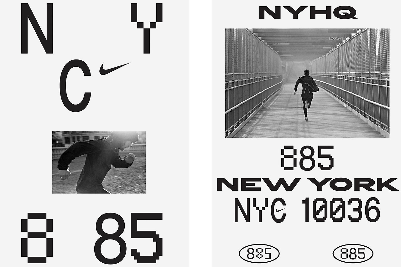 이 나이키 디자인에서 타이포그래피는 중심 초점은 아니지만, 사진의 역동감을 강화하기 위해 사용됩니다. 왼쪽에서 C를 왼쪽으로 밀고 나이키 로고를 나란히 배치하면 아래 사진에서 인물의 팔이 뛰는 동시에 뒤로 밀리는 모습을 연상시키게 합니다. 이 이미지는 달리는 인물이 오른쪽 다리를 올리면서 앞으로 뻗고, 왼쪽 다리는 뒤로 뻗는 모습을 간신히 보여줄 모습으로 크롭 되어 있는데, 그 아래 "885"의 갈라진 부분이 그의 자세를 추상적으로 표현하는 역할을 합니다.