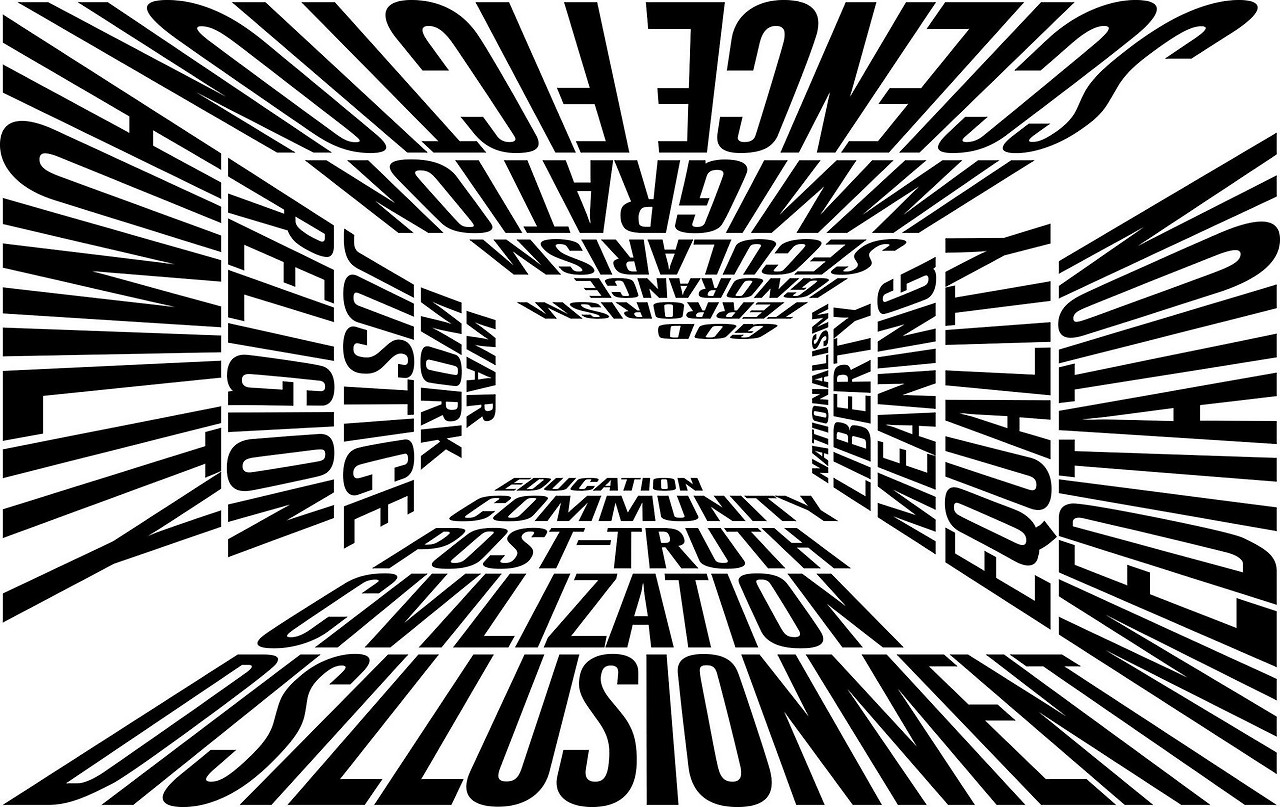 또 다른 Svendsen의 작업물입니다! 이 삽화는 21 Lessons for the 21st Century의 리뷰를 위해 제작되었습니다. Svendsen은 글자를 당신이 거대한 돌기둥 안에서 위를 들어다 보는 것 같은 현기증을 일으키기 위해 활자를 사용합니다. (21개의 단어를 4면에 집어넣은 것이 감탄스럽네요, Svendsen)