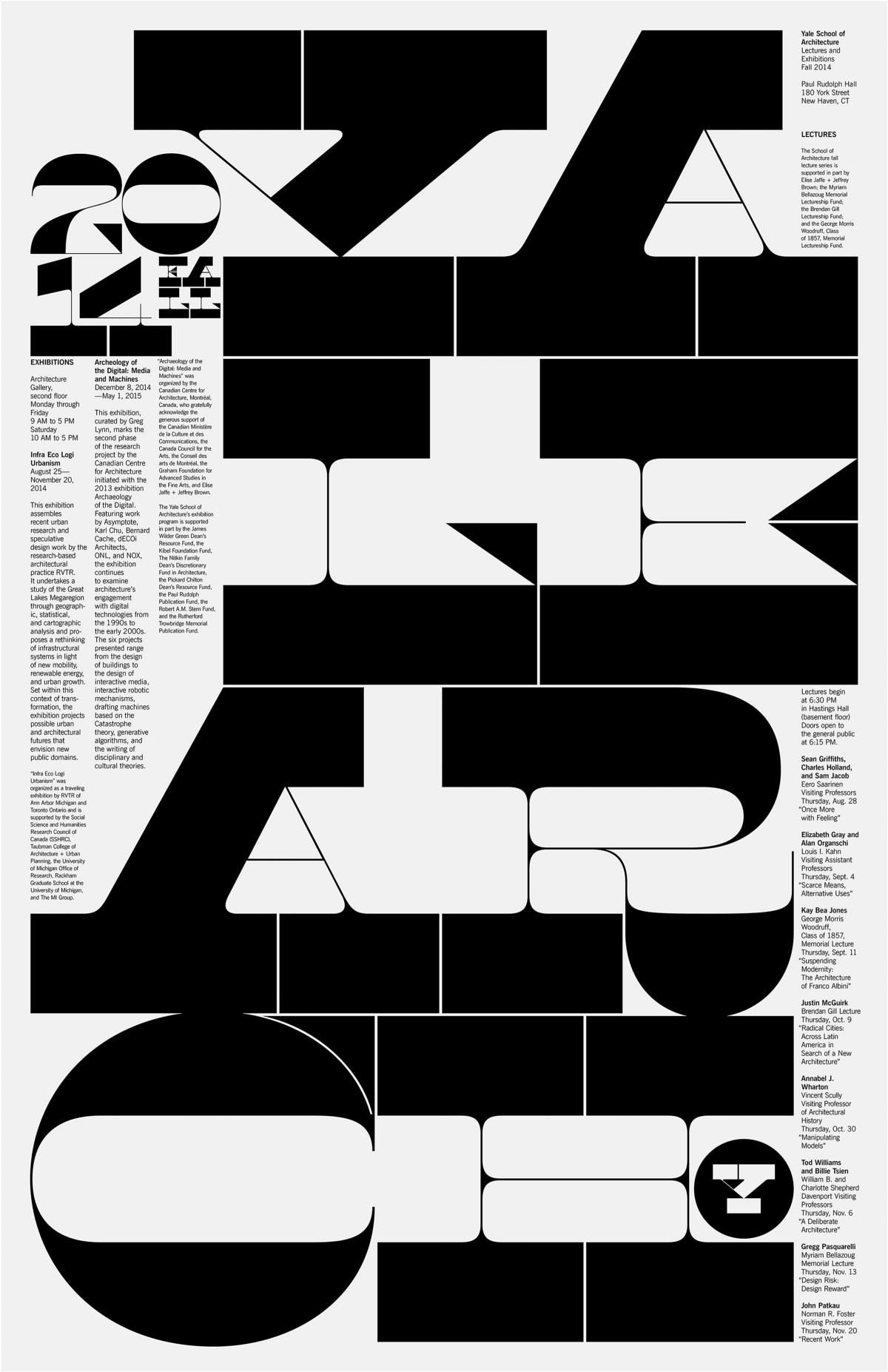 Svenden은 디스플레이 활자의 모양이 포스터 가장자리 주변의 구성을 가이드하게 합니다. "2014 Fall"은 Y의 벌려진 arm 아래 여백 공간을 채우며, A는 포스터 구성의 왼쪽 아래 가장자리를 메꾸는 데 사용됩니다. 원형 Y 배지는 H(우측 하단)에 끼워져 다른 공간에 갇히는 것을 방지합니다.