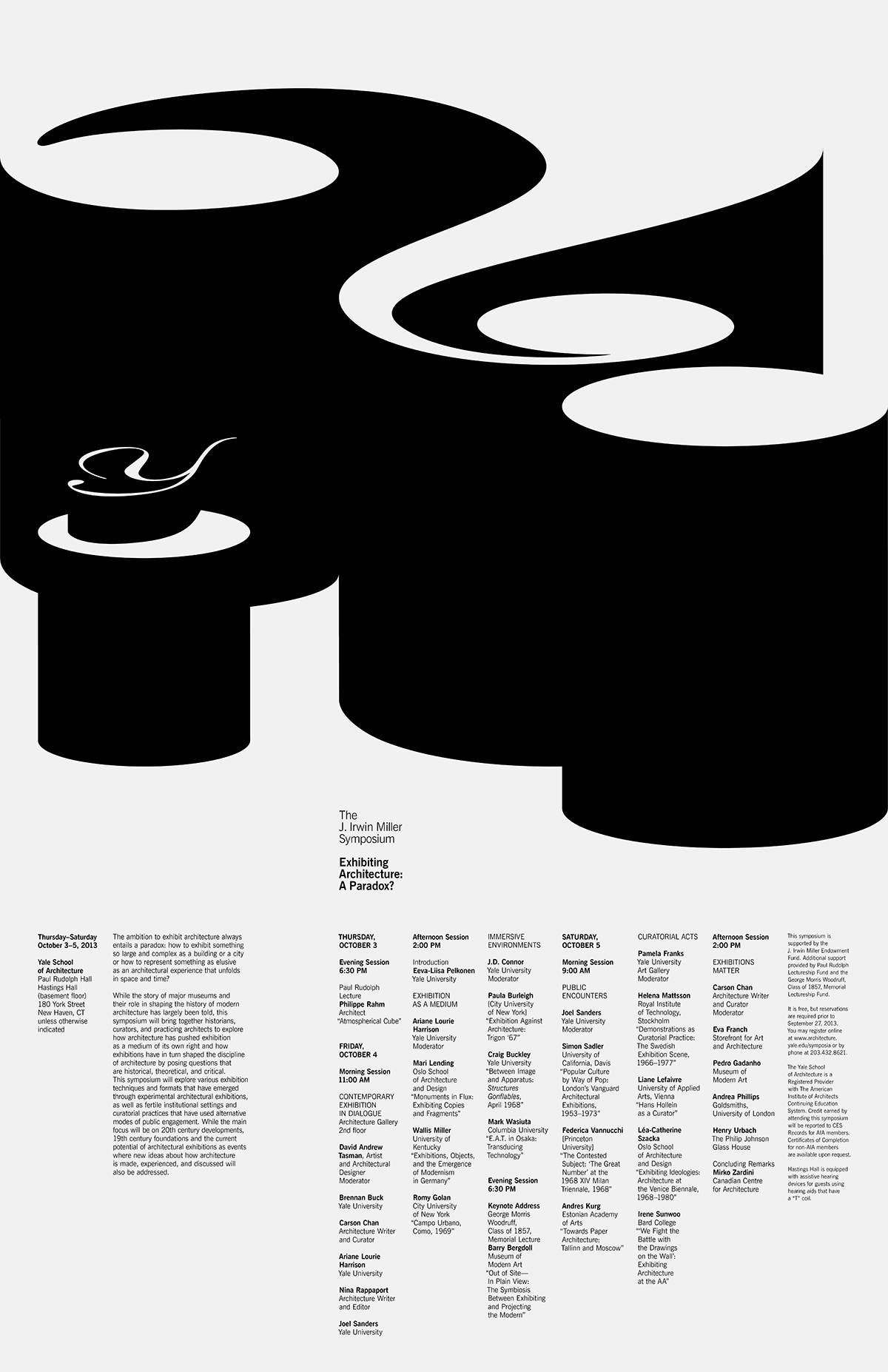 우선 훌륭하고 확실한 예시부터 시작해봅시다. Jessica Svendsen의 'Exhibiting Architecture: A Paradox?'는 예일 건축 프로그램을 위해 그녀가 만든 숨 막히는 포스터 시리즈 중 하나입니다. (이 시리즈의 다른 포스터도 곧 소개할 예정입니다.)