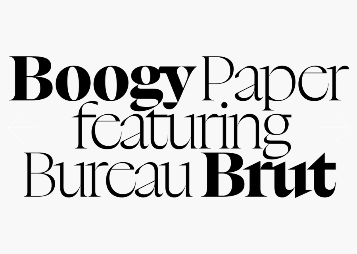 폰트 파운드리 Bureau Brut과 캘리그래퍼 Julien Priez의 합작, Boogy Brut입니다. 강한 획 대비와 날카로운 세리프 등의 캘리그래피적 성향이 강하면서도 높은 가독성과 디지털 폰트의 완성도까지 모두 챙긴 서체입니다. 낮은 descender로 위아래 공간적 효율도 매우 좋습니다.
