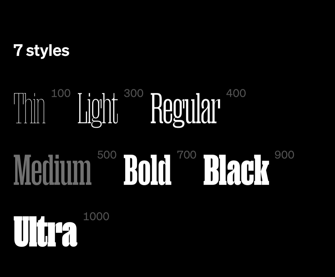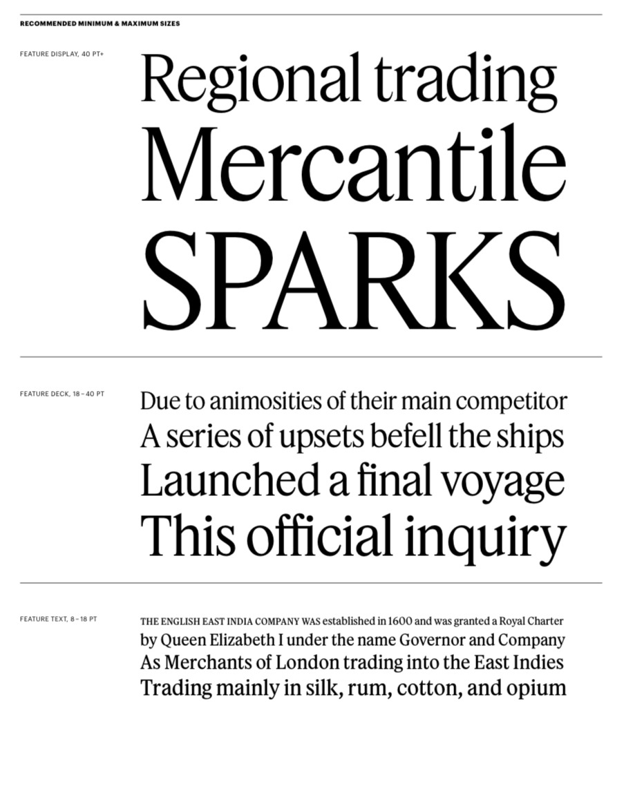 New York Times의 매거진을 위해서 처음 만들어져 이후에 여러 스타일로 확장된 세리프 서체, Feature입니다. 좁은 폭과 높은 x-height, 사선으로 된 축 등의 특징을 가지고 있어, 가독성과 공간 효율, 미적 요소가 까지 챙겼습니다.