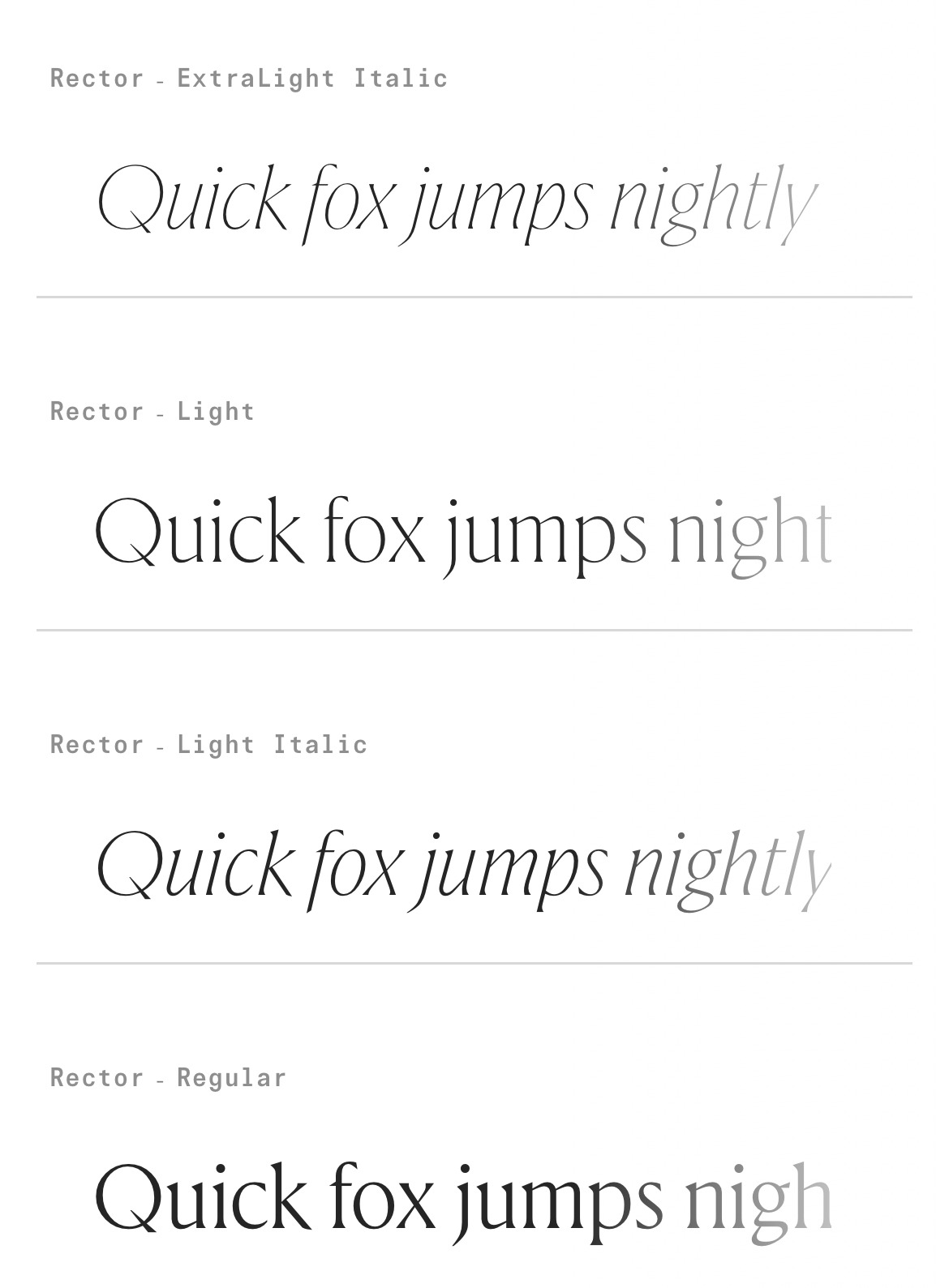 석각과 기념비에 새겨진 글자에서 영감을 받은 세리프 서체, Rector입니다. 획에 힘이 있으면서도 절제된 세리프 장식이 굉장히 매력적입니다. 다양한 두께뿐만 아니라 아웃라인 폰트와 같은, 세리프 서체 중에는 흔하지 않은 스타일도 서체 패밀리에 포함하고 있어 재미있는 디자인적 시도를 하기에도 좋은 서체입니다.