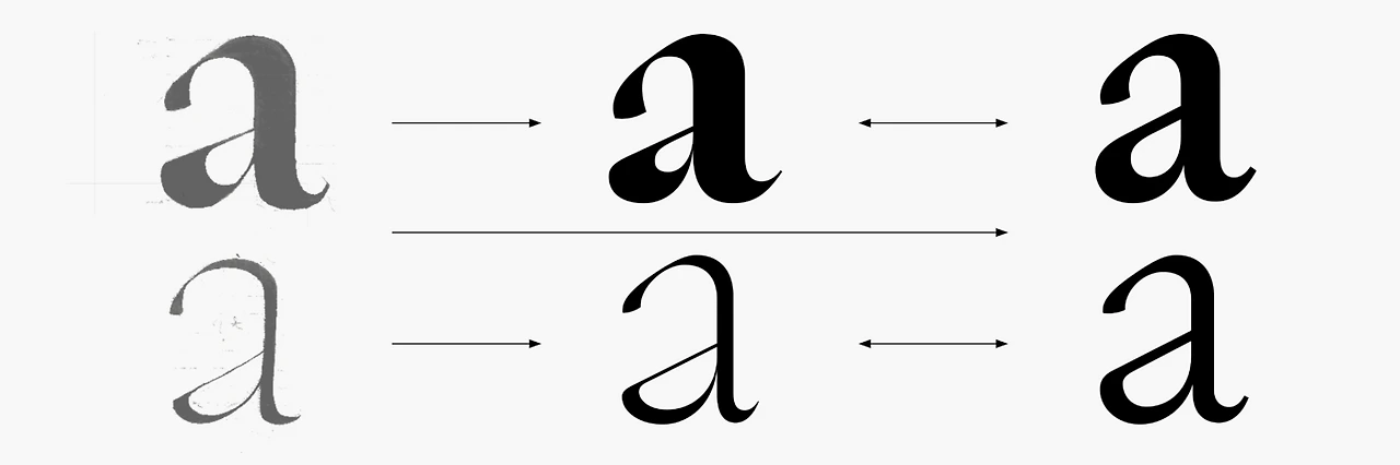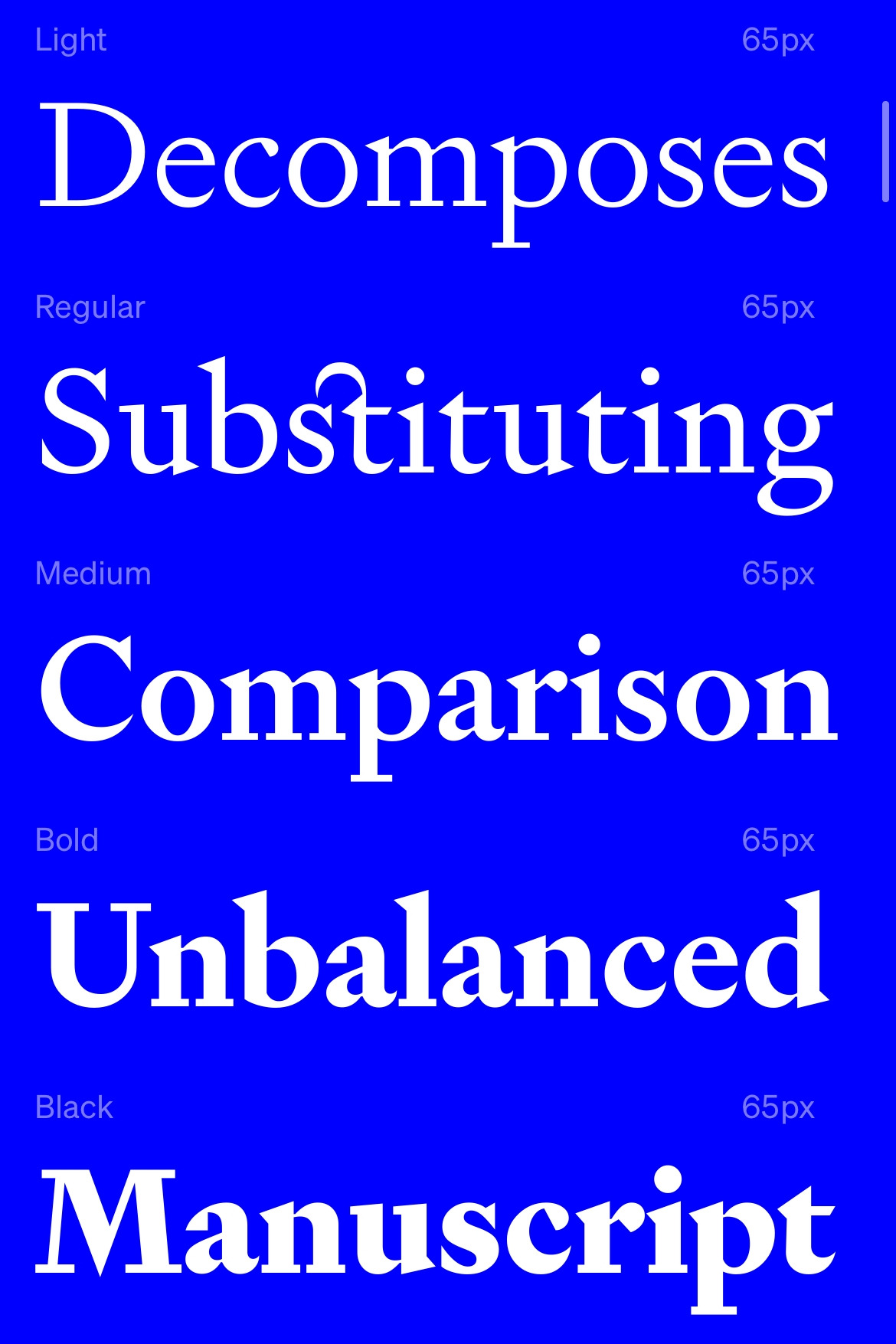 17세기 English Roman 스타일의 재해석으로 시작하여, 디지털적 특성을 더한 세리프 서체입니다. 글자 획이 곡선에서 직선으로 떨어지는 디테일이 전통적인 세리프들과 차별성을 가지면서도 높은 가독성을 가지고 있어 본문용으로도, 디스플레이용으로도 훌륭한 서체입니다.