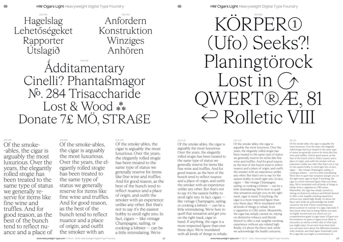 유명한 Century 서체를 사용한 담배 브랜드 Malboro의 옛 광고물에서 영감을 받아 제작된 세리프 서체, Cigar입니다. 클래식하면서도 현대적인 터치로 모던 브랜드에 과거의 향수를 불러일으킬 수 있는 서체입니다.
