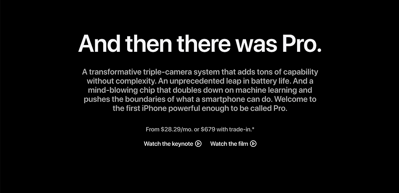 최근 몇 년 사이 볼드 타이포그래피가 큰 트렌드였는데, 애플도 본문 텍스트를 Regular가 아닌 Bold로 처리하여 사용하고 있습니다. 긴 텍스트가 아니기에 가독성이 떨어지지 않고 오히려 콘텐츠의 집중력을 높입니다.
