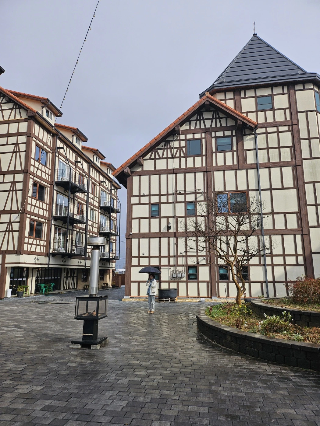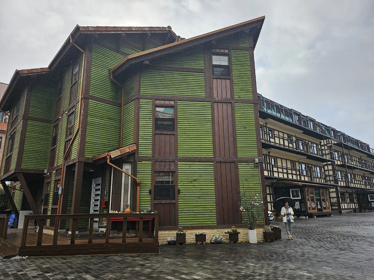 몸과 마음이 든든해진 우리는 오늘의 목적지 유럽마을로 향했다. 다시 내리는 가는 비에 파란 하늘이 11월의 가을을 겨울로 바꾸는 듯했다. 드디어 도착한 눈앞의 유럽마을은 엥겔베르그란 이름의 여러 개의 건물이 모인 마을이었다. 부슬부슬 내리는 비 속의 건물들은 이국적이면서 독특한 디자인이 멋지고 특이했다.