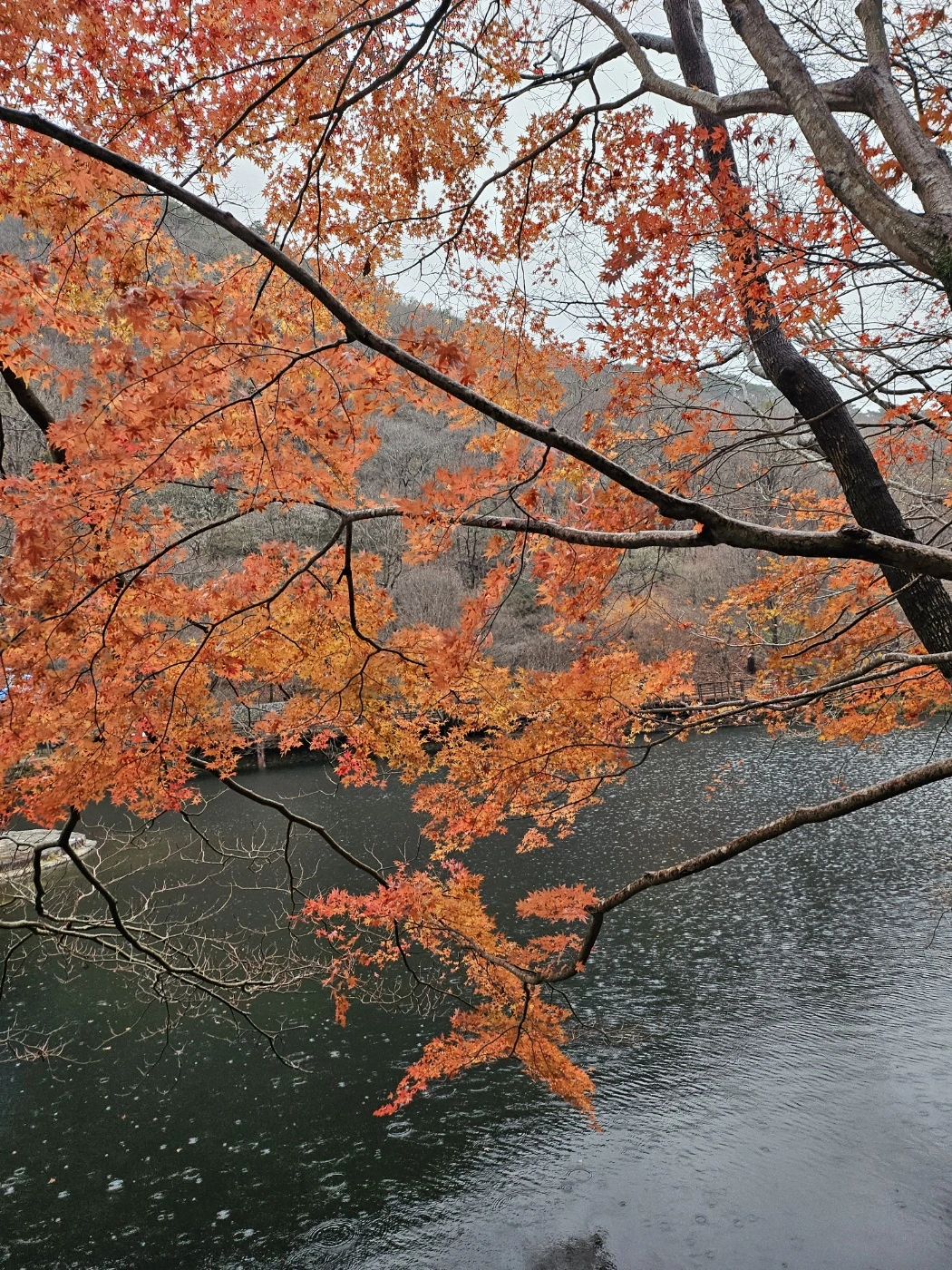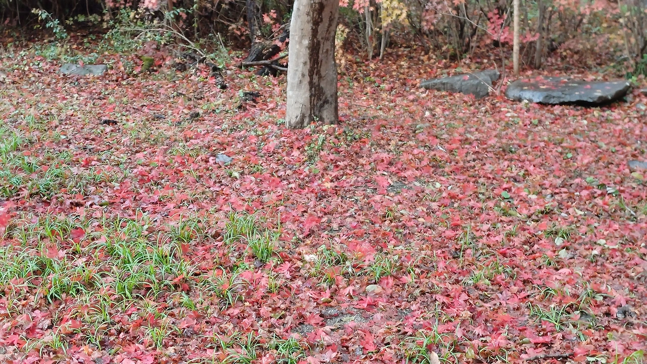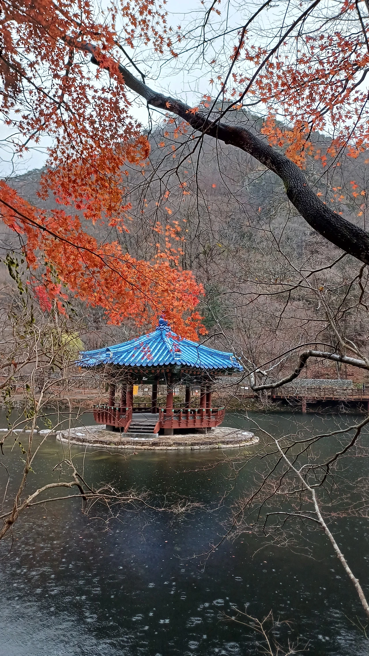 내장사의 단풍은 지난가을 늦더위에 다 늦게 색을 바꾸며 찐한 형형색색의 모습을 간직하고 있었다. 이날 내리는 11월 가을비에 운치를 더하며 명화 속 장면인 듯 눈호강에 마음까지 울렁였다. 그림이 표현 못할 붉은색과 노란색에 주황과 주홍이 어우러지며 파란 하늘과 잿빛이 교차하는 배경 속 파노라마를 연출했다.