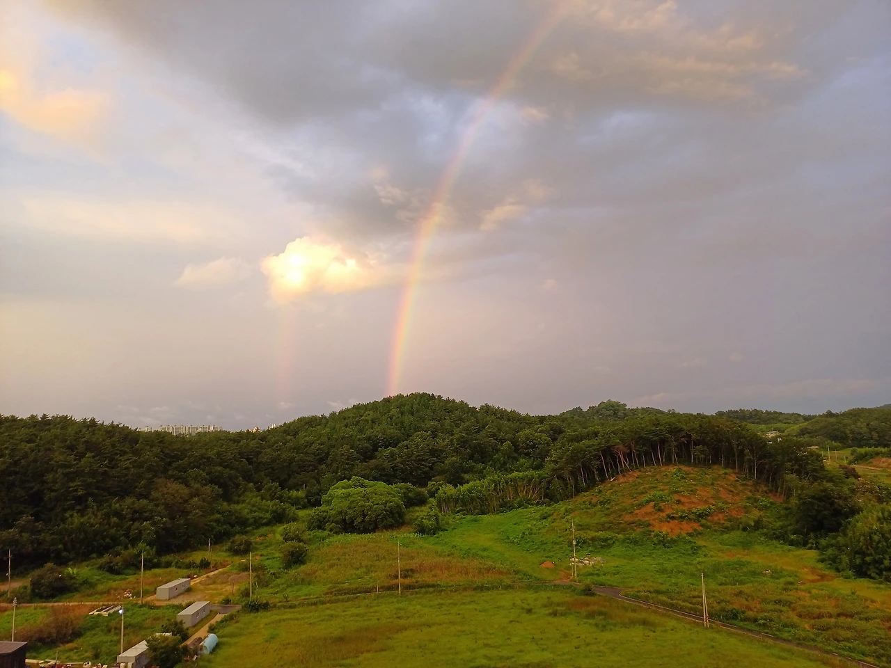 찜통더위가 주춤하며 태풍 예보가 시작되던 날 저녁 무렵 하늘에 쌍 무지개가 떴다.